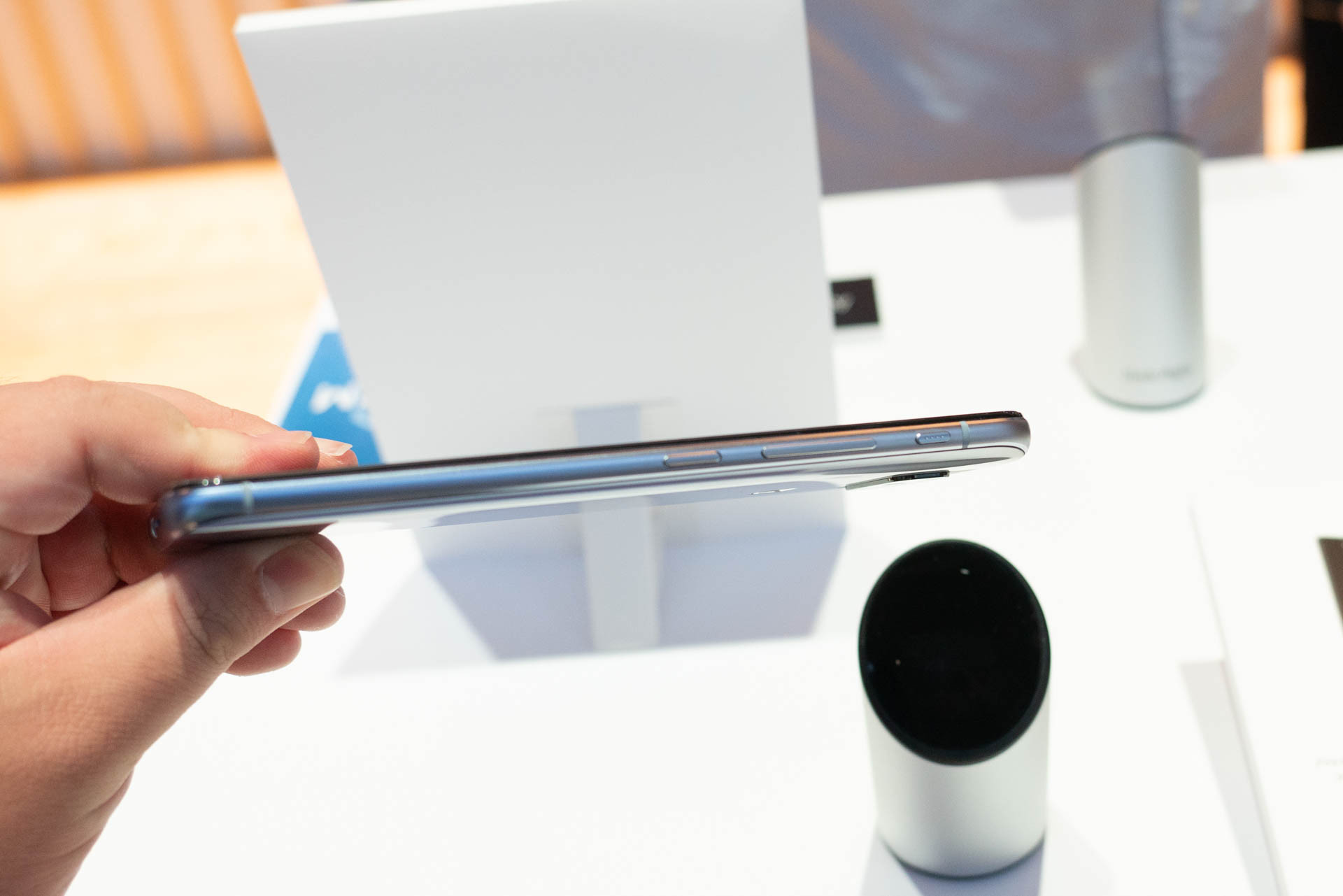 本体右側面には各種キーが集約されており、写真右側からスマートキー、音量上下キー、電源/スリープキーの順に配置されています。なお、スマートキーは初期状態ではGoogleアシスタントの呼び出しが割り当てられていますが、設定で割当機能の変更も可能です。