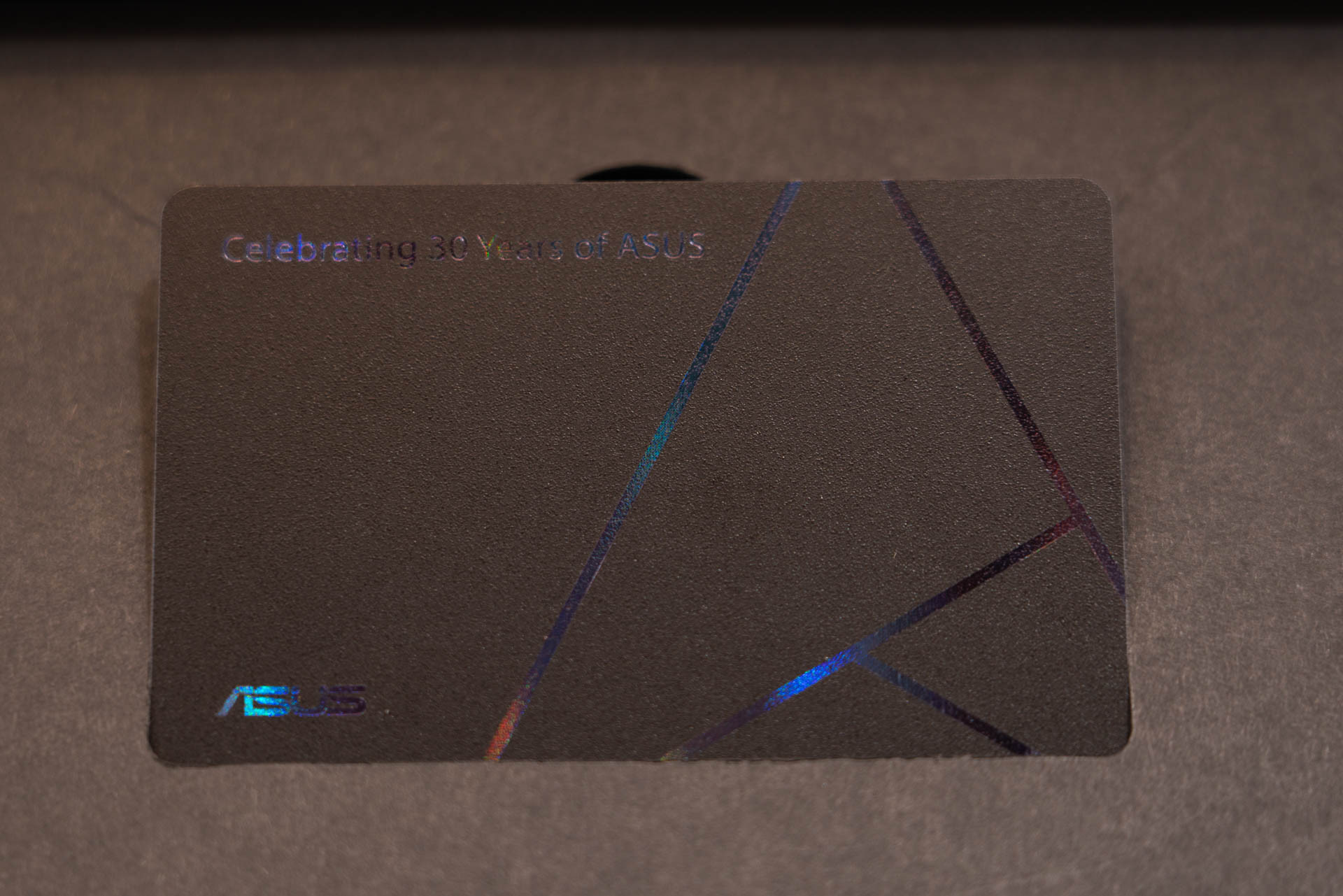 本体カラーは専用カラーのマット仕上げのブラックで、ZenFoneや同社のノートブックPC「ZenBook」でお馴染みとなる同心円状のスピン加工が施されています。また「ASUS」のロゴの向き、そして30周年の記念ロゴが印字されている点も通常モデルと異なっています。