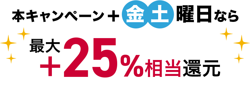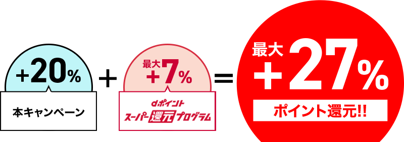 今回実施されるキャンペーンに加えてさらに買い物の購入金額の最大+7%をdポイント(期間・用途限定)で還元する「dポイント スーパー還元プログラム」と合わせると、街のお店では最大+27%のdポイントを還元されます。またオンラインストアの場合も+5%が還元されるd曜日(毎週金・土曜日)に最大+25%となります。