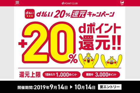 NTTドコモは5日、スマートフォン(スマホ)など向け決済サービス「d払い」にて買い物をした際に通常進呈するdポイントに加えてさらに購入金額の+20%のdポイント(期間・用途限定)を還元する「d払い20%還元キャンペーン」を2019年9月14日(土)から10月14日(月・祝)まで実施するとお知らせしています。