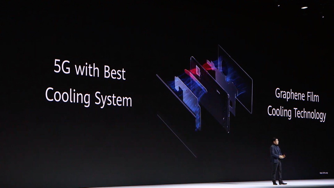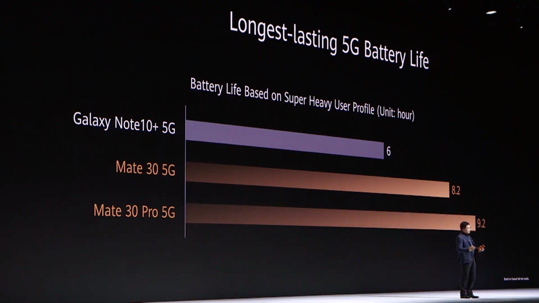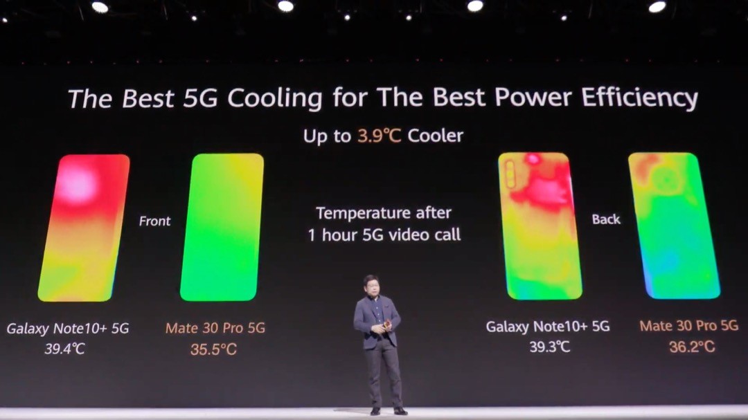 これらの高性能化や5Gなどへの対応による発熱を抑えるために炭素原子フィルムを用いた冷却システムを導入。同じく5Gに対応したサムスン電子製スマホ「Galaxy Note10+ 5G」よりも5Gで動画ストリーミング再生をした場合における発熱が少ないことが紹介されました。そして電力消費も大きくなるため、HUAWEI Mate 30およびHUAWEI Mate 30 5Gでは4200mAh、HUAWEI Mate 30 ProおよびHUAWEI Mate 30 Pro 5Gでは4500mAhの大容量バッテリーを搭載。