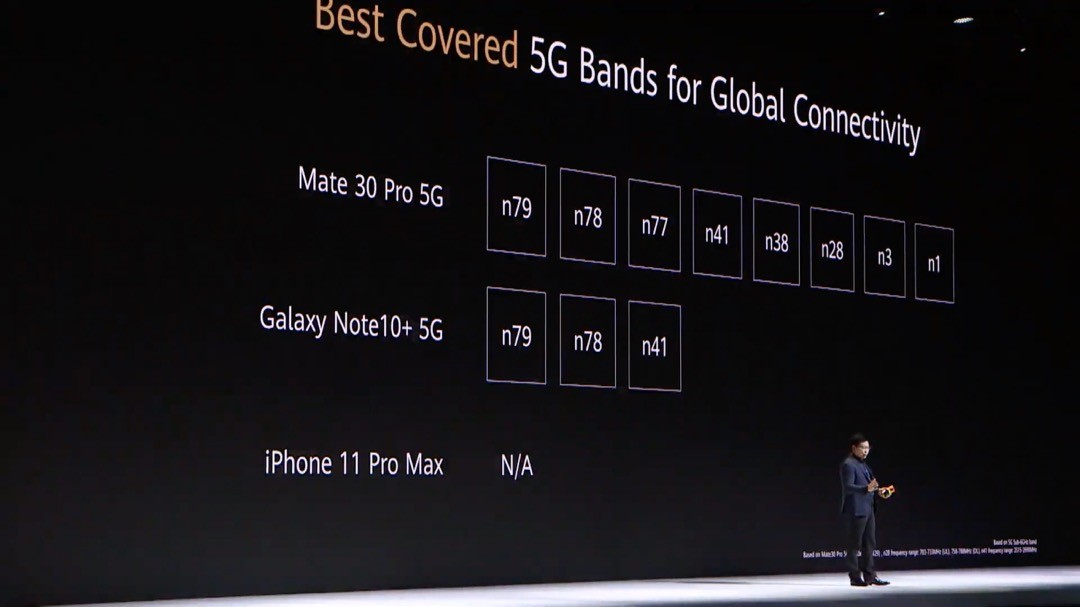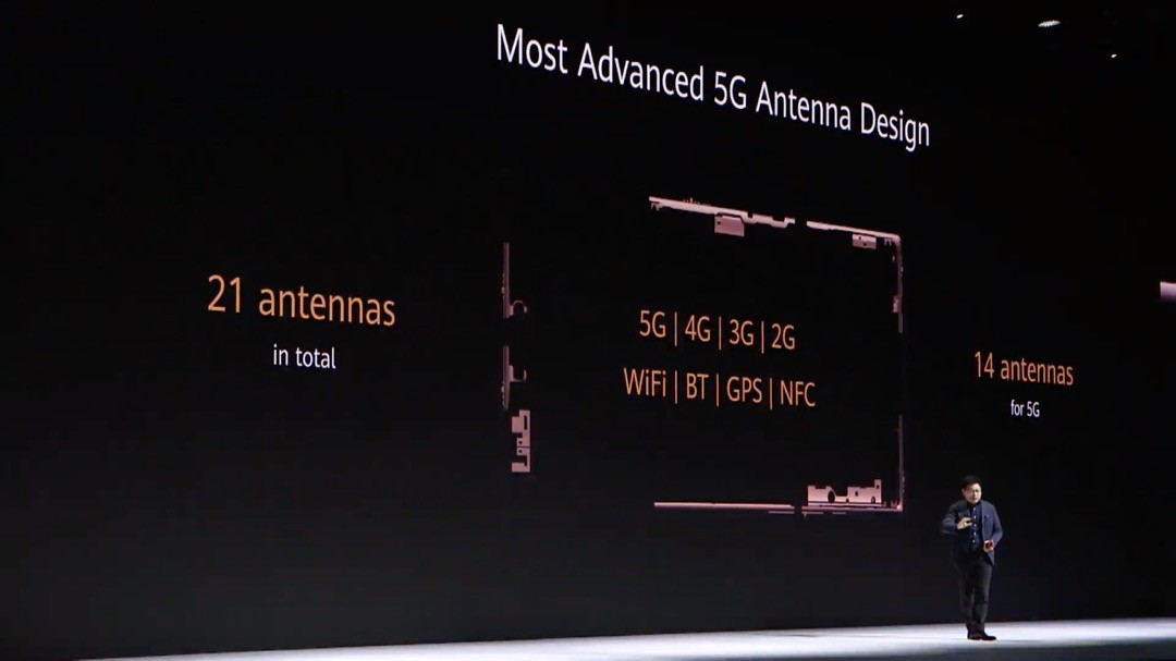 これにより、5Gに対応したHUAWEI Mate 30 5GおよびHUAWEI Mate 30 Pro 5Gは5GのNSAおよびSAをサポートし、5Gの周波数帯はn79およびn78、n77、n41、n38、n28、n3、n1と8つに対応しているとのこと。また4G(LTE方式)の対応周波数帯も多く、5Gのためのアンテナを14本内蔵し、無線LAN(Wi-Fi)やBluetooth、NFC、GPSも含めると21本となっているということです。