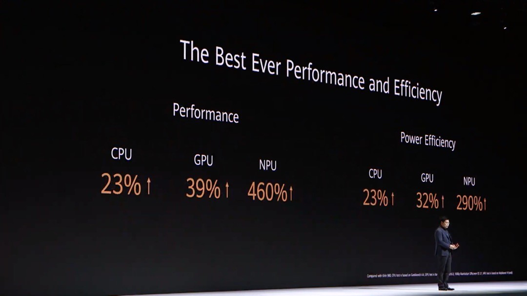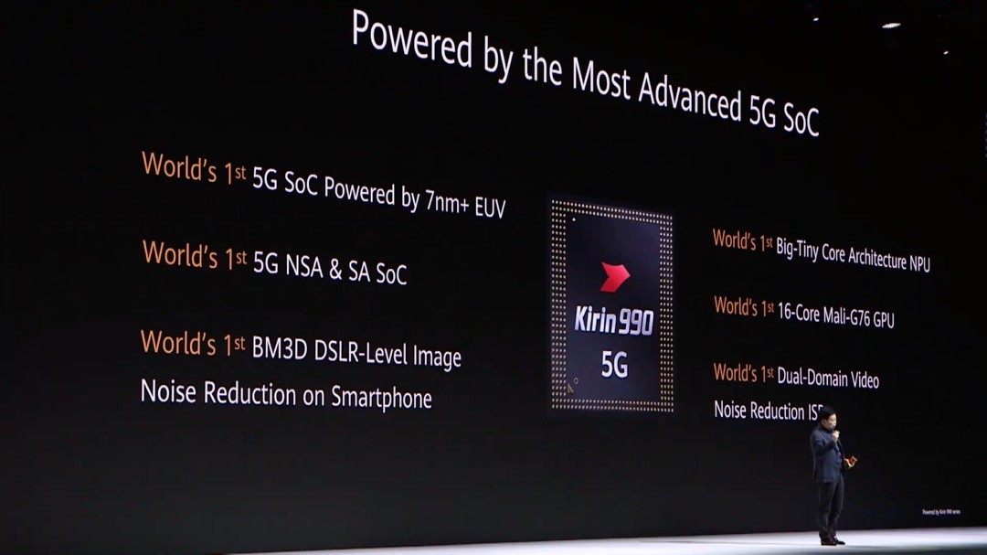 Kirin 990シリーズでは最大2.86GHzのクアッドCPUや16コアのARM Mali-G76 GPU、AI(人工知能)の処理のためのヴィンチアーキテクチャーによる専用プロセッサー「デュアルコアNPU」、新開発の画像処理プロセッサー「ISP 5.0」によって高性能化されており、既存のHUAWEI Mate 20や「HUAWEI P30」シリーズなどに搭載されている「Kirin 980」と比べて性能がCPUで23%、GPUで39%、NPUで460%高速化。