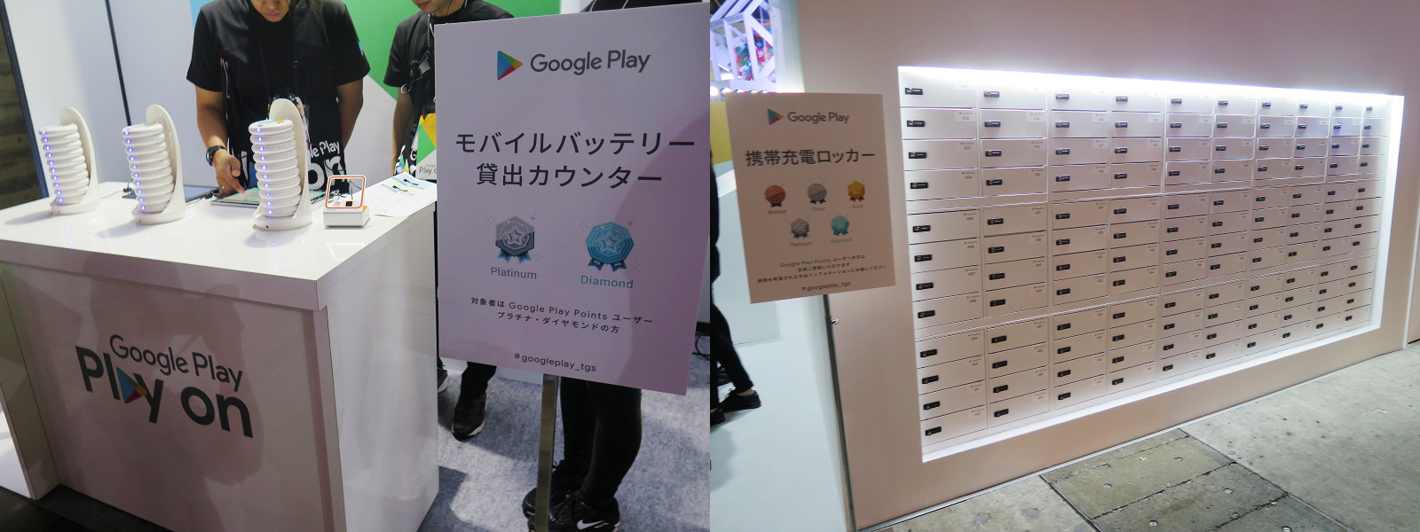 Google JapanではGoogleのAndroid向けアプリ配信マーケット「Google Play」名義にて会場内にブースを出展していました。TGS 2019のオフィシャルアプリスポンサーとして昨年に引き続き、巨大ガチャやイベントステージといったブース展示のほか、会場内を回ってポイントを集めるポイントラリーやモバイルバッテリーの貸し出し(Google Pointのダイヤモンド・プラチナ会員限定)を行っていました。