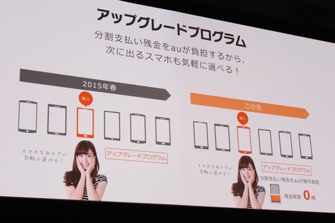 そうした中でauではこれまでも基本的にSoftBankの真似でしたが、あっさりと今度は問題点が少ないと見られるNTTドコモの真似にスイッチしてきました。条件は対象機種をauの個別信用購入あっせん契約/個品割賦販売契約(36回払い)で購入と同時にプログラムに加入し、加入時に購入した機種をauが回収することで特典が適用されます。