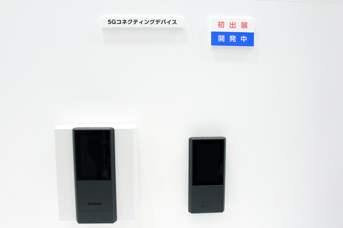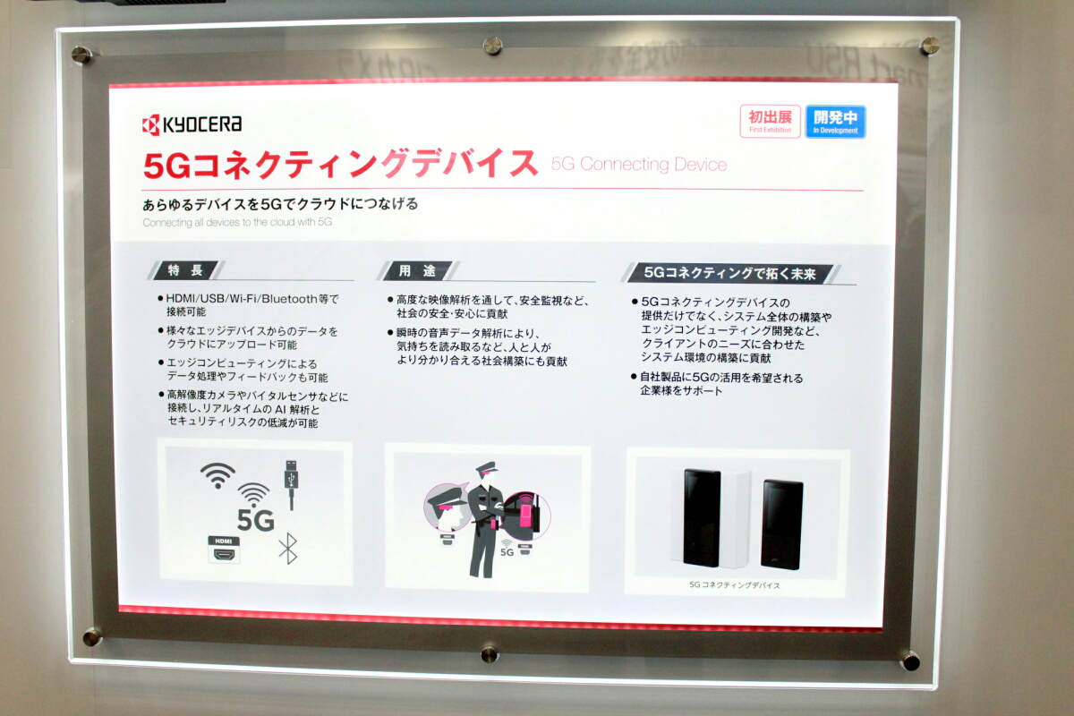 ブース内の5Gへの取り組みを紹介するコーナーでは、「5Gコネクティングデバイス」が展示されていた。この5Gコネクティングデバイスは、アンテナや基地局の類ではなく、5Gに対応した「端末」だ。展示はモックアップだったが、京セラが5G対応端末を展示するのは初。説明員によると、5Gコネクティングデバイスは、Wi-Fiルーターのようなものをイメージすると分かりやすいという。ルーターのように様々なデバイスを接続して、通信をするものだが、他のデバイスとの接続は、HDMIやUSB、Wi-Fi、Bluetoothなど汎用性を持たせたインターフェースを実装するという。