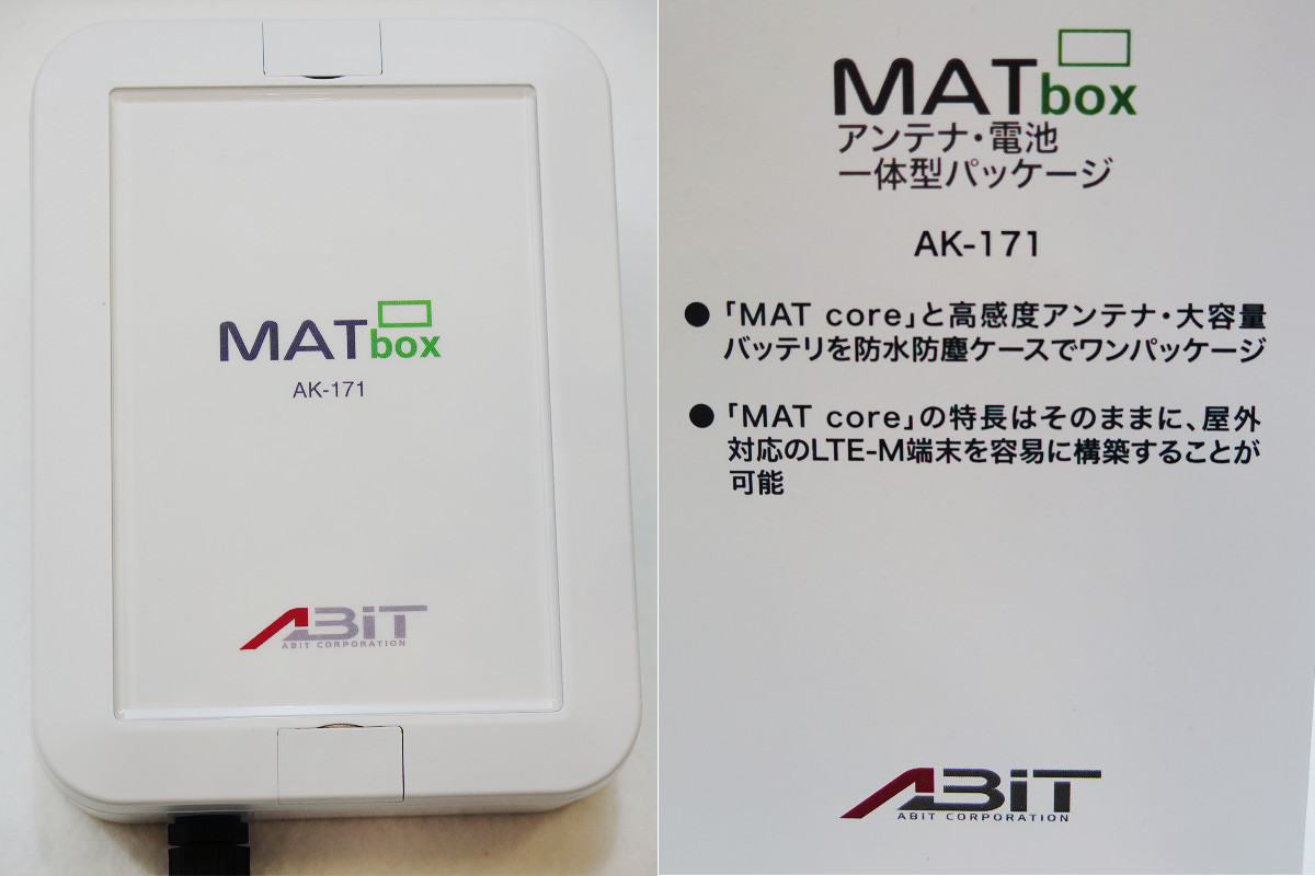 ファームウェアの書き換えにより、さまざまな用途に利用可能な柔軟性と低消費電力による長期間駆動を特徴とし、MAT Coreを格納する防水防塵(保護等級:IP67相当)機能と通信アンテナ、大容量バッテリー(19,200mAh)、外部IF(インターフェース)を一体化したパッケージボックス「MAT box」、さらにあらかじめ選択可能なオプションとしてMAT box経由でMAT Coreへ接続して利用する冠水センサーの「MAT aqua」、地滑り検知傾きセンサーの「MAT theta」が用意されています。