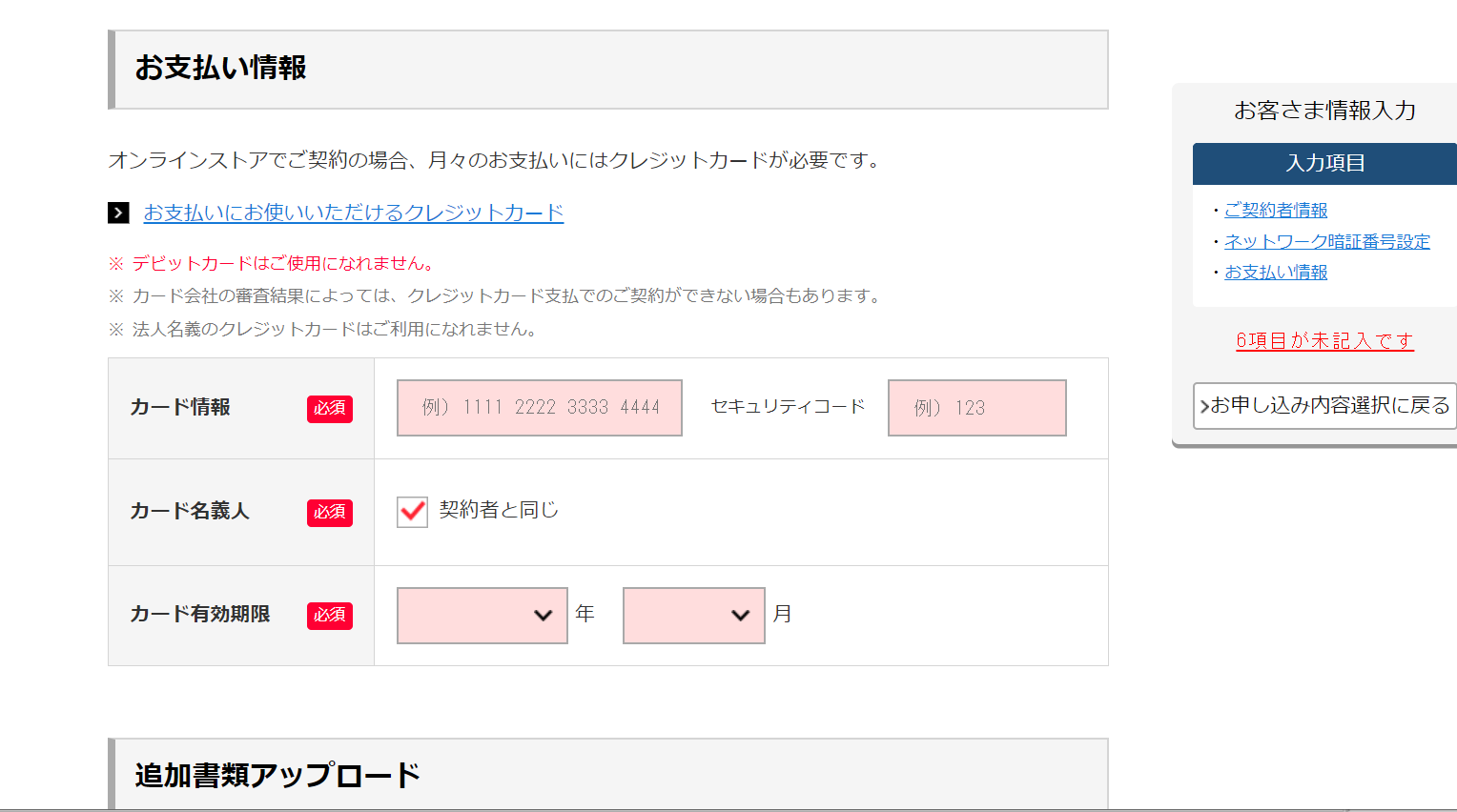 すべての入力が終了すると、「入力内容確認」「重要説明事項」と進んで申し込みが完了する。筆者はクレジットカードを持っていないため、ここで操作を断念し、改めて専用ダイヤルでの申し込みをした。