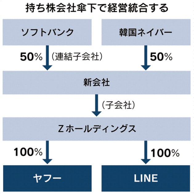 関係当局の承認を前提として統合の枠組みの詳細を詰めているとし、統合案としてソフトバンクとネイバーが50%ずつ出資する新会社を設立し、新会社がZホールディングスの7割程度の株式を保有し、Zホールディングスの傘下に100%子会社の「Yahoo! JAPAN」と「LINE」が入る案が検討されているということです。
