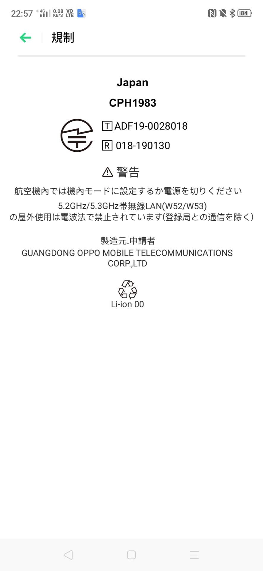 型番は64GBモデルと同じく「CPH1983」。技適の認証番号は電波法における技術基準適合証明(工事設計認証)が「018-190130」、電気通信事業法の技術基準適合認定が「ADF19-0028018」