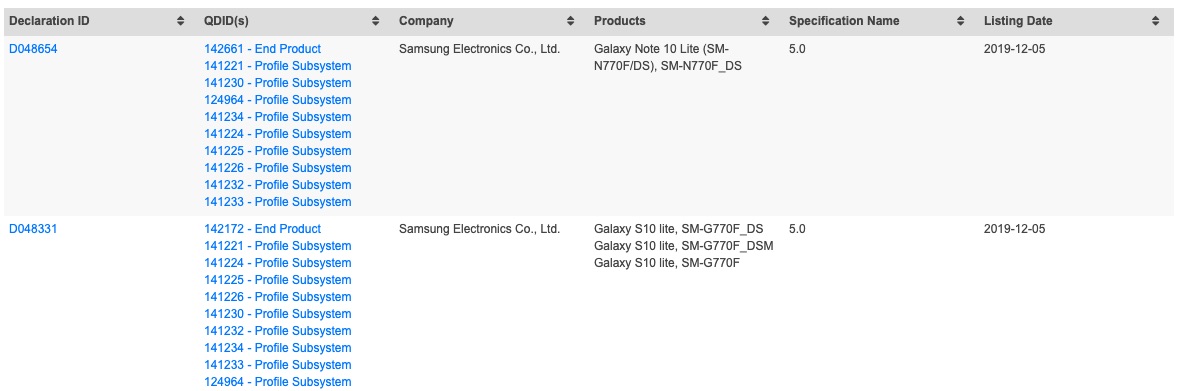 認証機関ではBluetooth SIGにてGalaxy S10 Lite(Declaration ID:D048331)およびGalaxy Note10 Lite(Declaration ID:D048654)ともに12月5日付で通過しているほか、Galaxy S10 Liteは米連邦通信委員会(FCC)も11月20日付で通過(FCC ID:A3LSMG770F)しています。またFCCではすでに発表されているGalaxy Noteシリーズ以外の製品向けのSペン「EJ-PN770」が11月27日付で通過(FCC ID:A3LEJPN770)しています。