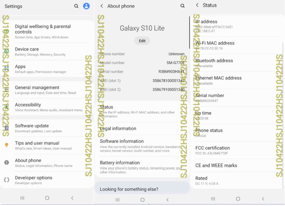 一方、FCCの資料からGalaxy S10 Liteについては外部ストレージとしてmicroSDカードスロットを搭載し、デュアルSIMモデルが存在するほか、電池パックの型番が「EB-BA907ABY L」となっており、Samsung Electronics Viet Namの工場によるベトナム製となることが明らかとなっています。またGalaxy S10 LiteのSM-G770F/DSはLTE DL Category 11およびLTE UL Category 5に対応し、下り最大600Mbpsおよび上り最大50Mbpsをサポートしています。
