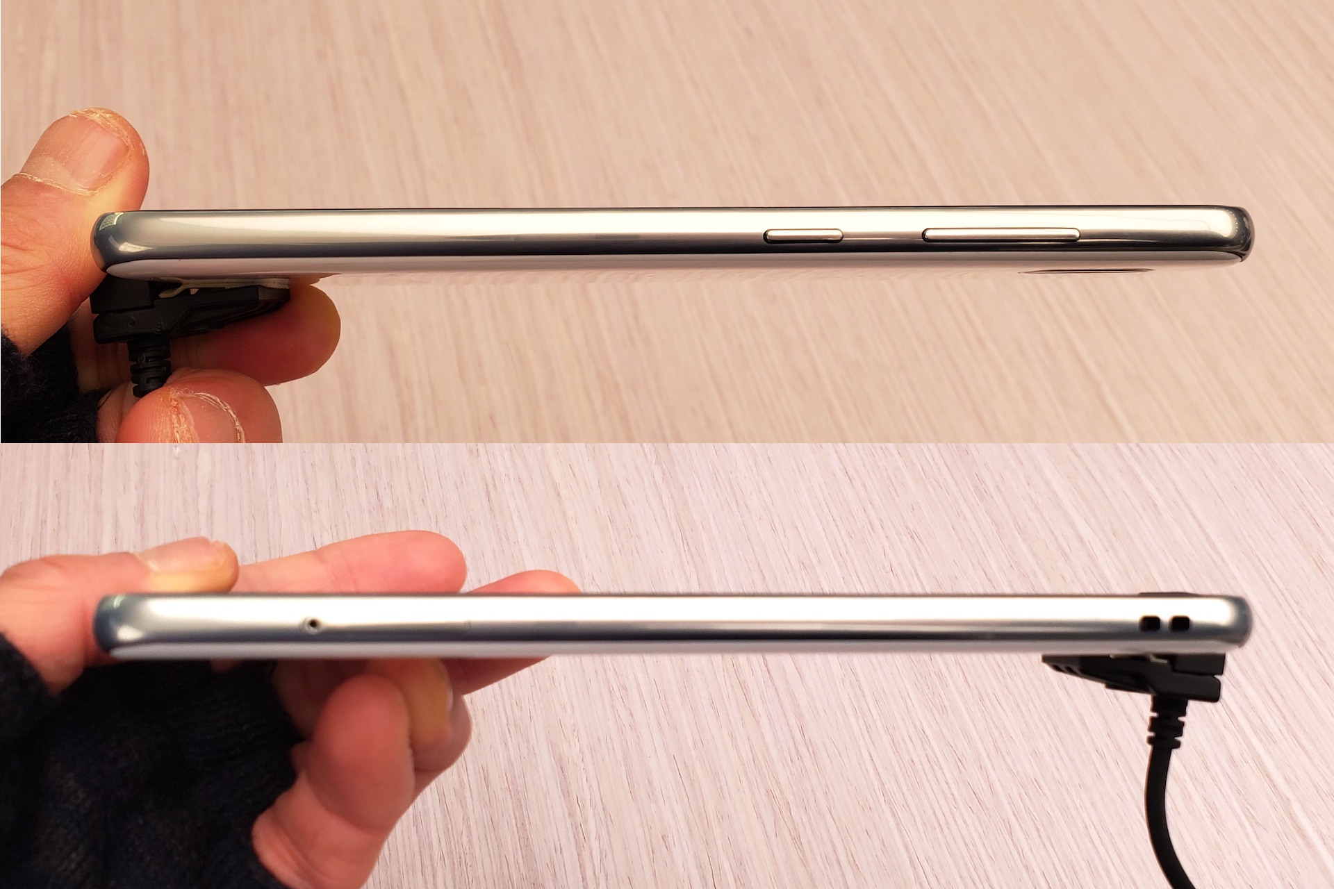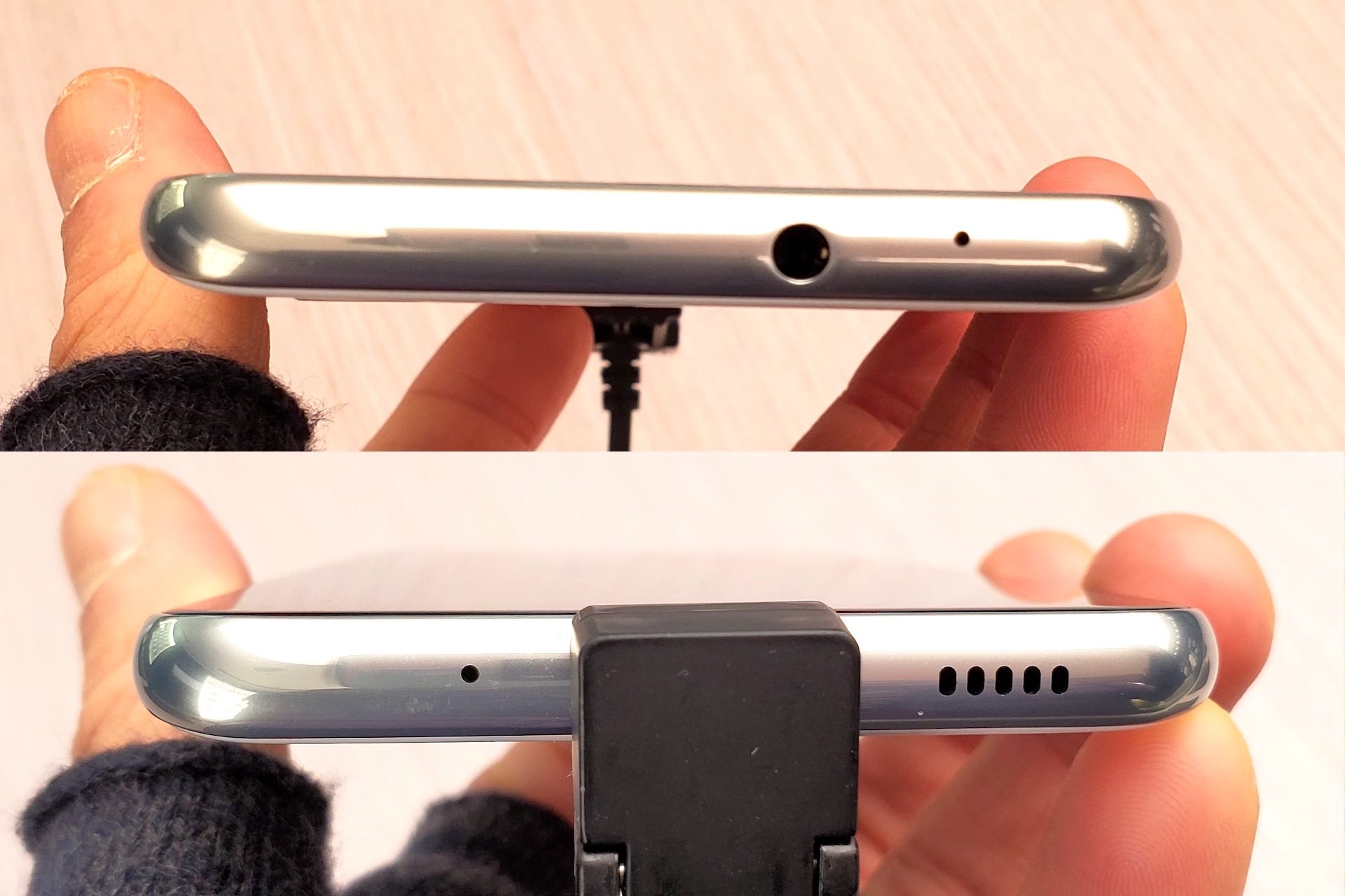 右側面には音量上下キーと電源キー、左側面にはSIMカード/microSDXCカードスロットとストラップ穴、上側面にはサブマイクと3.5mmイヤホンマイク端子、下側面には通話用マイクとUSB Type-C端子(USB 2.0)、外部スピーカーが搭載されている。