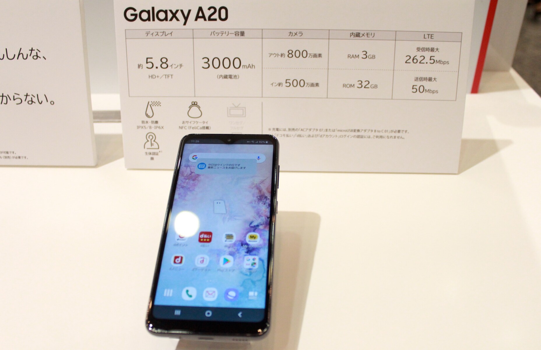 Galaxy A20は海外向けに販売されている「Galaxy A10e」をベースに日本向けに防水(IPX5およびIPX8準拠)や防塵(IP6X)、おサイフケータイ(FeliCa)、ストラップ穴といったニーズの高い機能に対応し、さらにFMラジオにも対応しているのでインターネットラジオ「radiko」とともに利用できるハイブリッドラジオ「ラジスマ」に対応しているコストパフォーマンスの高いモデルだ。