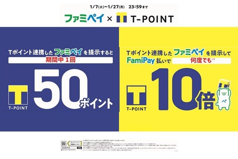 キャンペーンではファミリーマートでの買い物の際にTポイントを連携したファミペイを提示することで期間中1回50ポイント進呈するほか、Tポイントを連携したファミペイを提示してファミペイで利用できるコード決済サービス「FamiPay」で支払うと期間中何度でもTポイントが10倍貯まるとのこと。