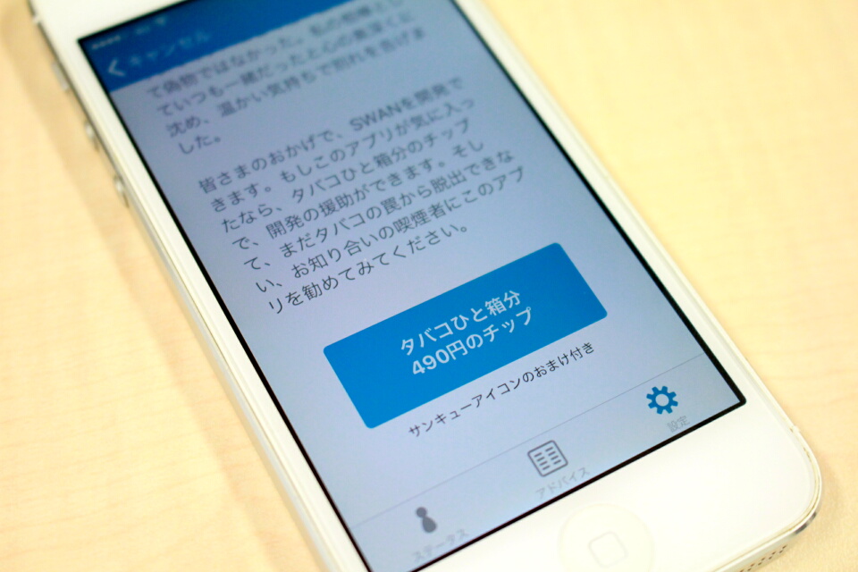 SWAN 卒煙はダウンロードしてもすぐにカウンターは動かない。では、どうすればいいか?まず、最初にやることは「アドバイス」を読むこと。およそ15分で読み終える「卒煙の前に知ってほしいこと」を読めば「卒煙」ができるというのだ。
