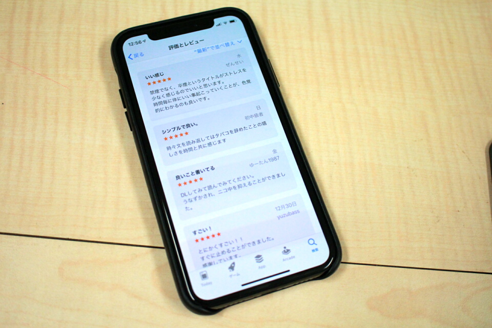 実は筆者はこのアプリがリリースされるおよそ1年前にタバコをやめている。そのため、残念ながらこの「SWAN 卒煙」で卒煙を実践することはできなかったのだが、それでも「卒煙の前に知ってほしいこと」を読んだときは、これはスゴい!と強烈な印象を受けたことを覚えている。App Storeでのレビューも軒並み高評価で、検索順位も上位で表示されるようになっている。ちなみに「禁煙」で検察した場合は、「SWAN 卒煙」よりも前に公開されたアプリを抑えて、2番目に表示されるまでになった。