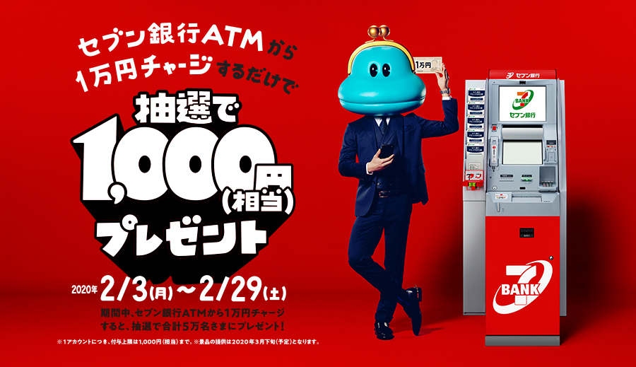 セブン銀行は3日、期間中に対象のスマートフォン(スマホ)など向け決済サービスに「セブン銀行ATM」から10,000円以上チャージすると抽選で5万人に1,000円(相当)が当たる「セブン銀行ATMチャージキャンペーン」( https://www.sevenbank.co.jp/oos/adv/tmp_205.html )を実施すると発表しています。