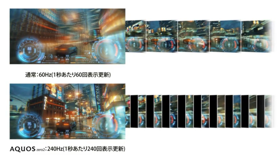 AQUOS zero2ではOLEDで240Hzという超高速駆動を行い、さらに本来の映像のフレーム間に黒のフレームを挟み込むことで、よりメリハリの効いた映像表現を実現した(つまり映像の実質フレームレートは120fpsになる)