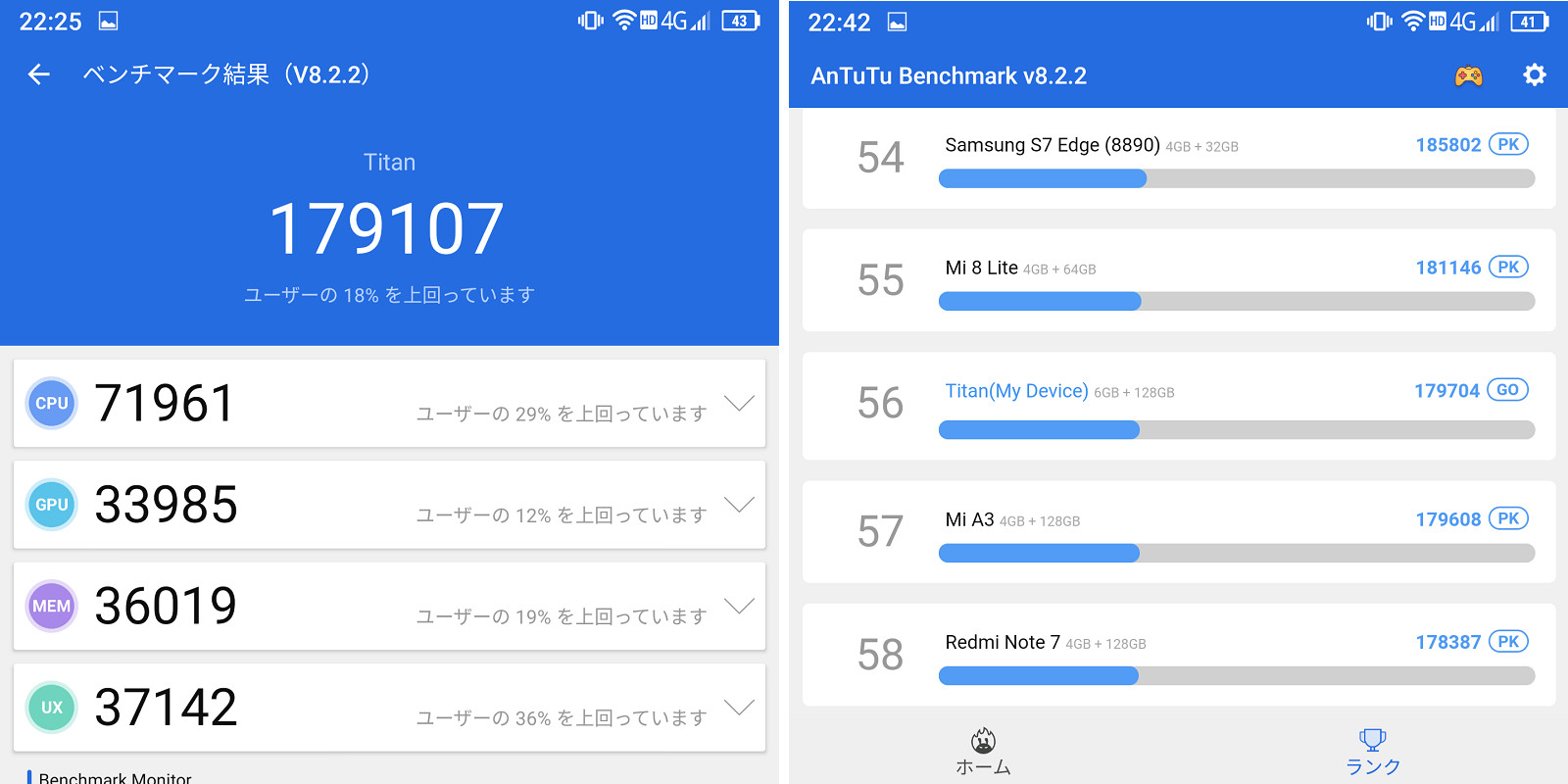 続いて、Unihertz Titanの性能をテストするベンチマークアプリでチェックしてみました。今回、テストに使用したアプリは定番のベンチマークアプリ、「AnTuTu Benchmark」と「PC Mark」を使用しました。それぞれ3回ずつ計測し、その中間のスコアをランキングと並べて掲載しています。