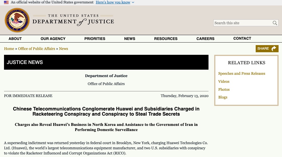 ・Chinese Telecommunications Conglomerate Huawei and Subsidiaries Charged in Racketeering Conspiracy and Conspiracy to Steal Trade Secrets | OPA | Department of Justice