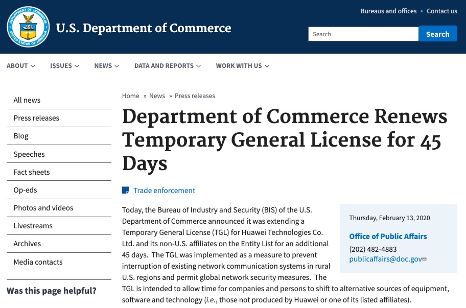 米国商務省(United States Department of Commerce)は13日(現地時間)、 昨年5月に同省の産業安全保障局(BIS)が中国の通信機器メーカーであるHuawei Technologies(華為技術、以下「ファーウェイ」)およびその関連企業を輸出規制リスト(Entity List)に追加したことに対して米国輸出管理規則(EAR)を改正する一時一般許可(TGL)をさらに45日間延長すると発表しています。