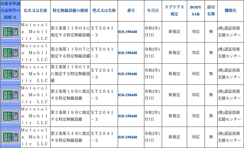 総務省が「技術基準適合証明等を受けた機器の検索」のデータベースを更新し、新たにLenovo傘下のMotorola Mobilityが「XT2041-3」(認証番号:018-190448)の工事設計認証(いわゆる「技適」)を2020年1月7日付けで認証技術支援センターによって取得しています。