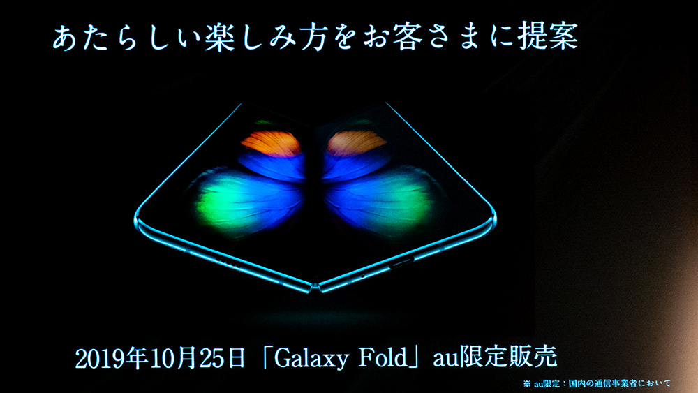 auからは昨年10月に発売された初のフォルダブルスマホ「Galaxy Fold(型番:SCV44)」は、折り畳んだ状態で約4.6インチのサブディスプレイと、開いた状態で約7.3インチのメインディスプレイを搭載する。コンセプトはコンパクトに持ち歩けるタブレット並みの大画面スマホで、映像コンテンツや電子書籍などとの相性が良い製品だった。