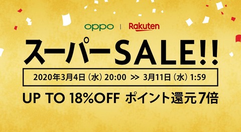 OPPO Japanは3日、楽天が運営する総合Webストア「楽天市場」( https://www.rakuten.co.jp/ )にて2020年3月4日(水)20:00から開催される「楽天スーパーSALE」にて対象のSIMフリースマートフォン(スマホ)「OPPO Reno 10x Zoom」および「OPPO R17 Pro」、「OPPO AX7」が13〜14%OFFまたはポイント7倍還元になるとお知らせしています。