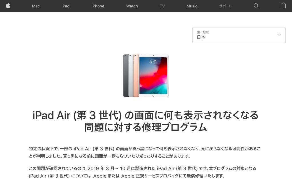 | iPad Air(第3世代)の一部製品に画面が何も表示できない不具合!対象なら無料修理 |