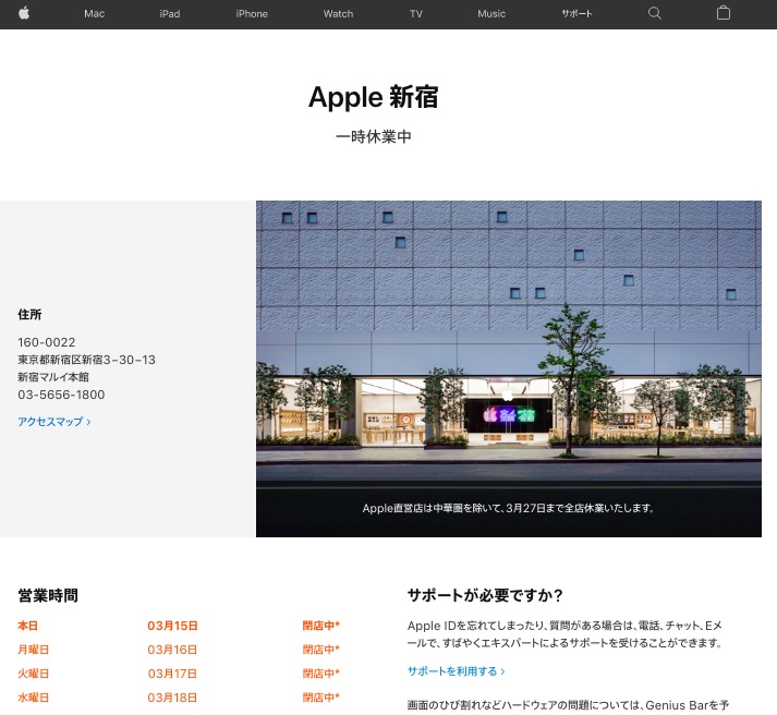 また同社では中華圏(中国)以外の直営店「Apple Store」を3月27日(金)まで休業するとし、日本では3月15日(日)から一時休業しており、同社ではオンラインストア(公式Webサイト「Apple.com」や専用アプリ「Apple Store」)を利用し、サービス&サポートについては公式Webサイトを確認するよう案内しています。