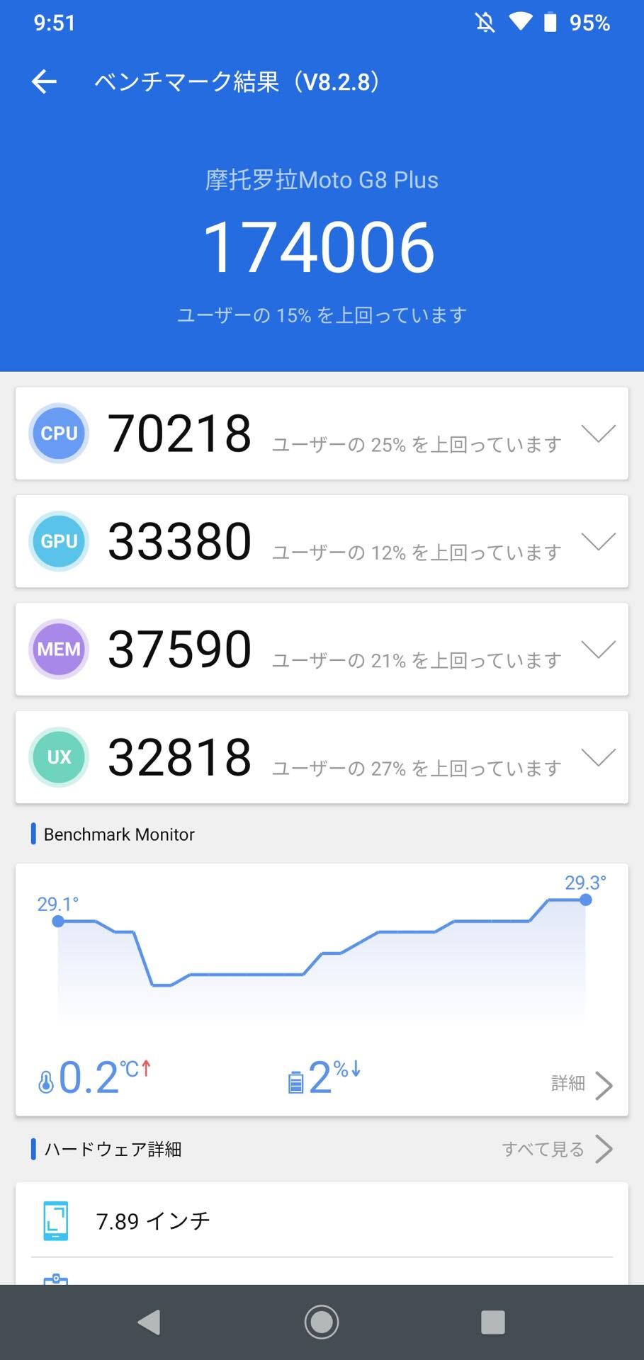 ハードウェア情報(画像=左)とベンチマークアプリ「AnTuTu Benchmark」(v8.2.1)による結果(画像=右)。総合スコアでは173813(174006、173846、173588)程度となっていた