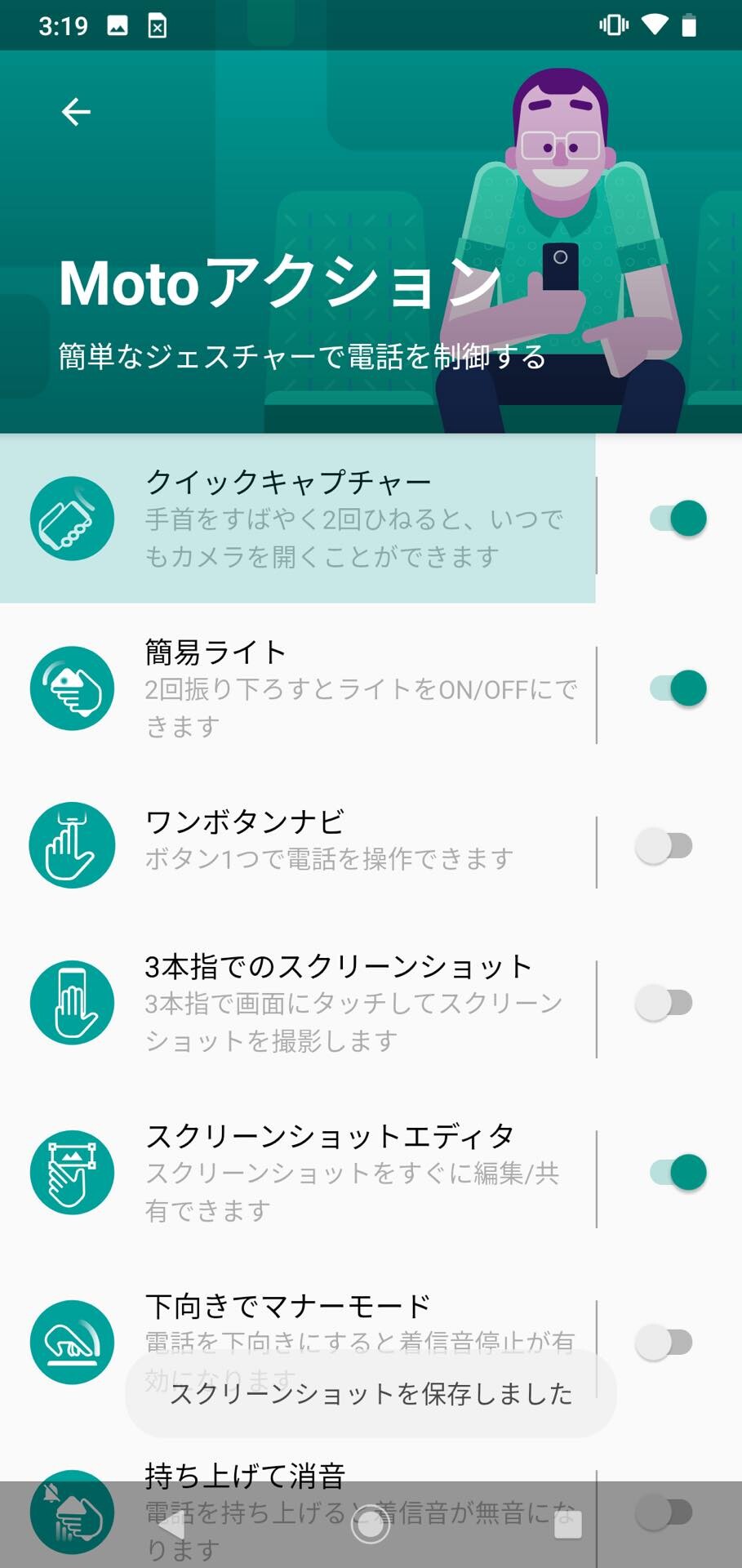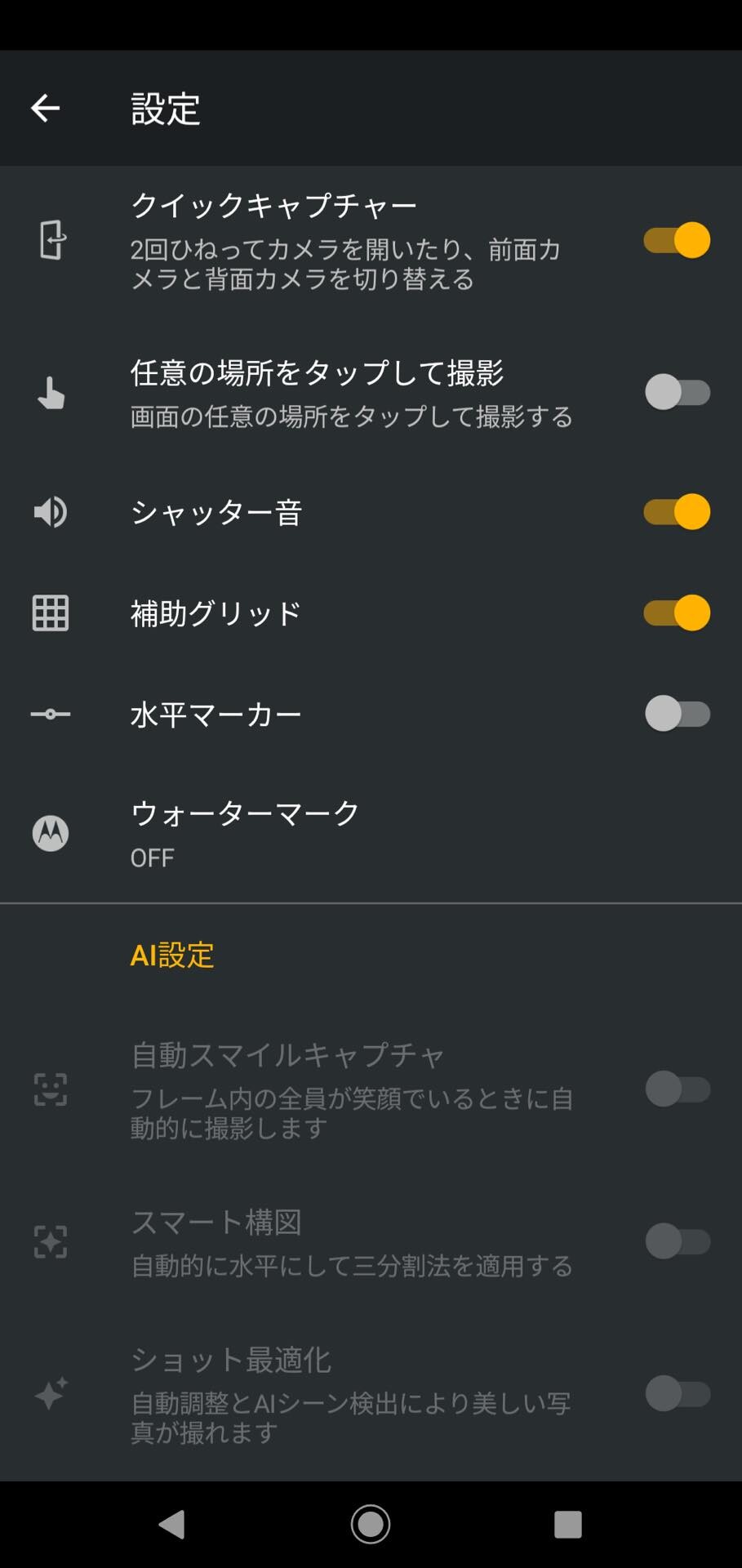 カメラアプリの設定画面。なお、moto g7シリーズと同様にSIMカードを装着しない状態ではオフにできるものの、日本の携帯電話回線のSIMカードを装着するとシャッター音のオフにできなくなる仕様ですが、マナーモードにすることでシャッター音を鳴らないようにできる模様(製品版で同じかどうかは不明)