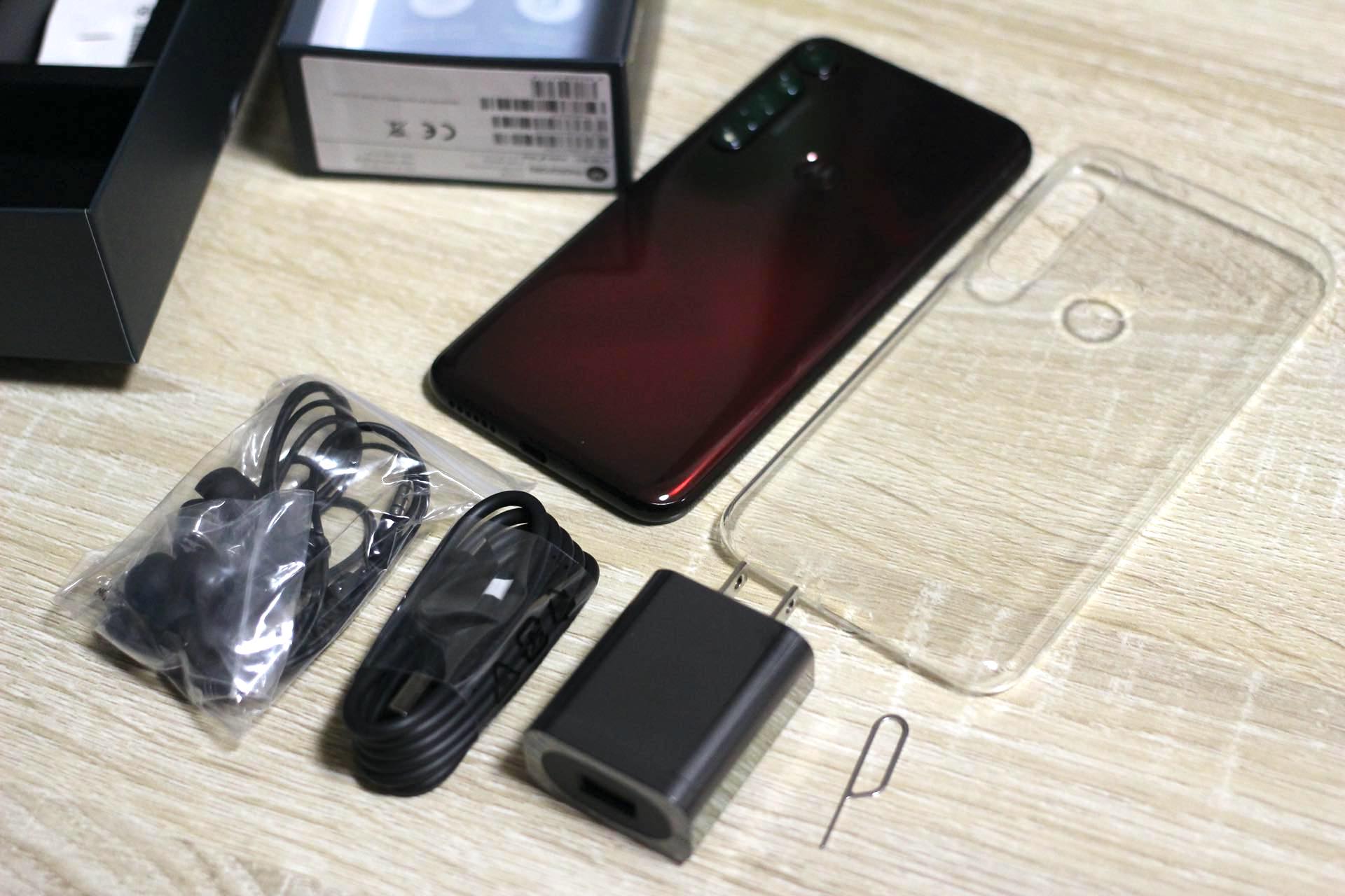 moto g8 plusの同梱品。急速充電(18W)に対応し、18W ターボパワーUSB充電器の他にUSBケーブルおよびヘッドセット、カバー、SIM取り出しピン、クイックスタートガイド、LG(法令・安全・規制)といった紙類が付属