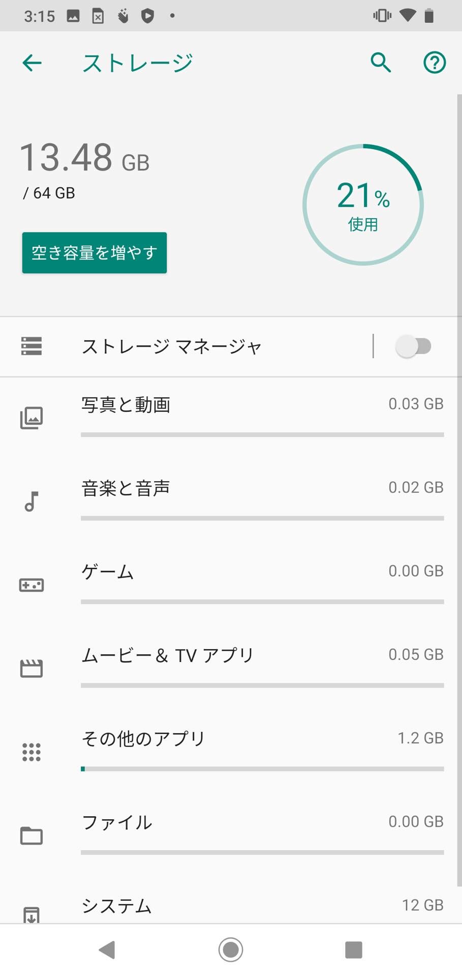 内蔵ストレージは初期状態で約13.48GB使っており、残り約50GBが空いている。あまりストレージを使わない人ならデュアルSIMでmicroSDカードを利用せずに済むかもしれない。購入時は電源キー2回押しはアシスタント起動に設定