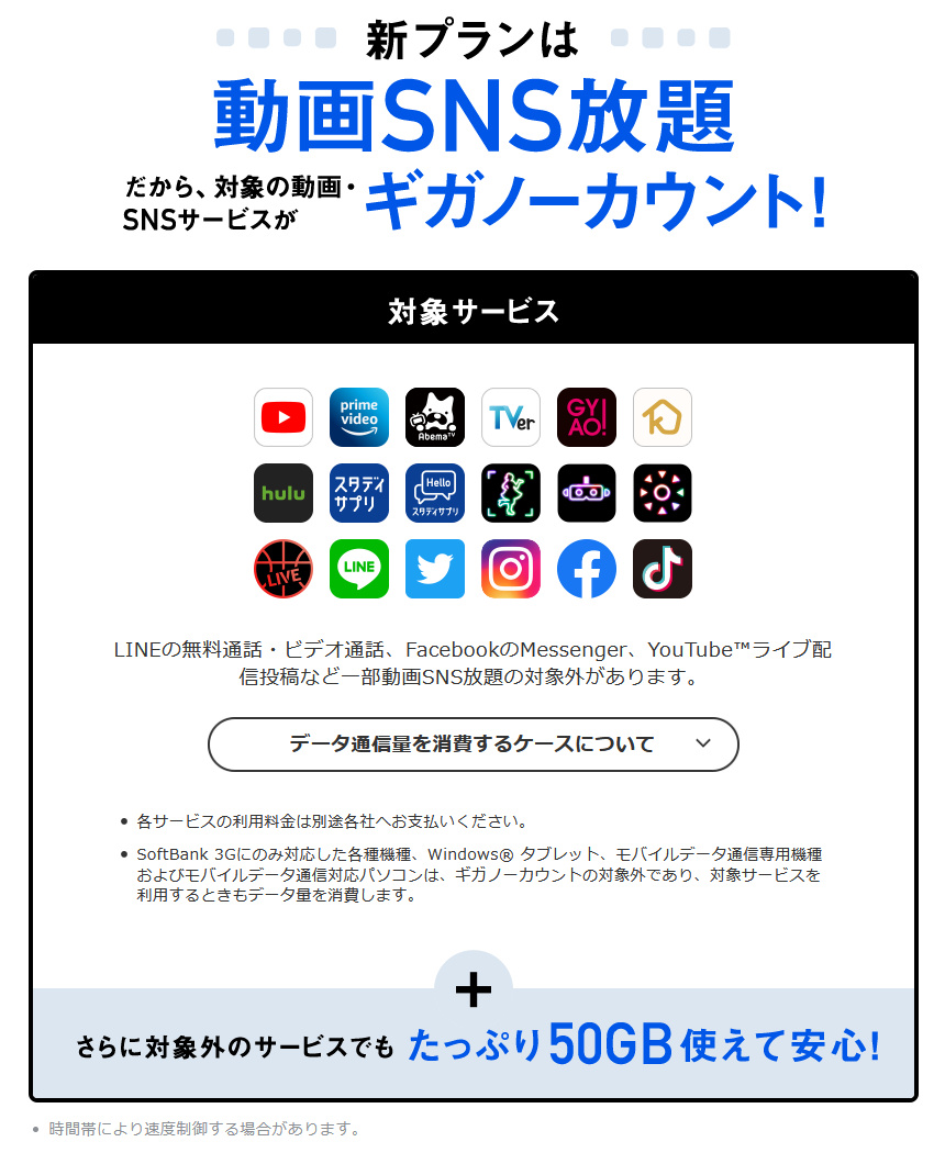 新プランではなく4G向けプランの条件がそのまま適用されることから、例えばデータプランメリハリの場合は50GBの容量上限があるものの、YouTubeやAmazonプライム・ビデオ、Huluなどの動画配信サービスや、Twitter、LINE、InstagramなどのSNSでのデータ通信をカウントしない「カウントフリー」を採用しており、これらのサービスを頻繁に使う人には事実上の無制限に近いプランとなります(ただし、時間帯による速度制御あり)。