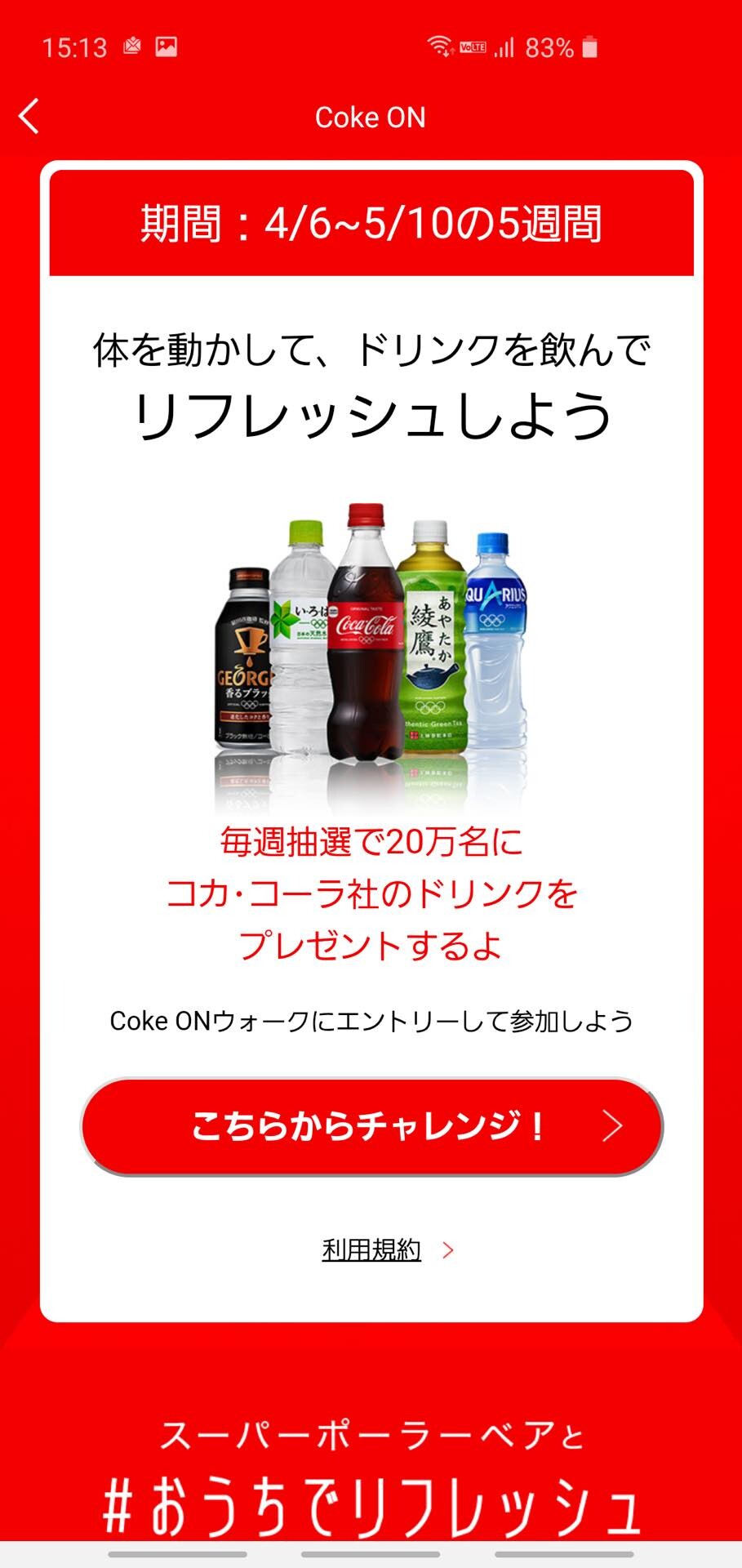 日本コカ・コーラは6日、同社の公式スマートフォン(スマホ)など向けアプリ「Coke ON」(コーク オン)にて飲料や体を動かすことを通じてリフレッシュしてもらいたいという想いから「#おうちでリフレッシュ」プログラム( https://c.cocacola.co.jp/app/refreshjapan/ )を実施するとお知らせしています。