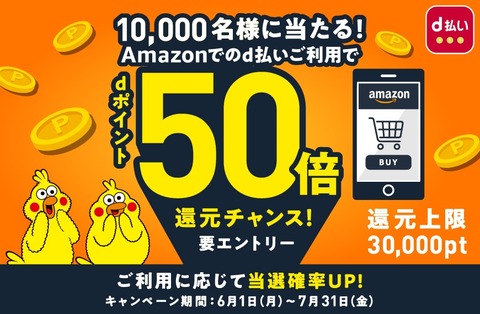 NTTドコモは1日、アマゾン ジャパンが運営する総合Webストア「Amazon.co.jp」( https://www.amazon.co.jp )において同社が提供する決済サービス「d払い」を使って買い物をした人の中から抽選で1万人に支払額に対して通常のの50倍のdポイントを還元するキャンペーン「Amazon d 払い d ポイント 50 倍還元チャンス 10,000 名様に当たる!」を実施するとお知らせしています。