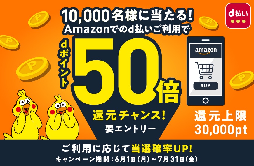 今回、これに加えてAmazon.co.jpでd払いで買い物を2回以上かつ10,000円以上した場合に抽選で通常の50倍を還元するAmazon d 払い d ポイント 50 倍還元チャンス 10,000 名様に当たる!キャンペーンが実施されます。
