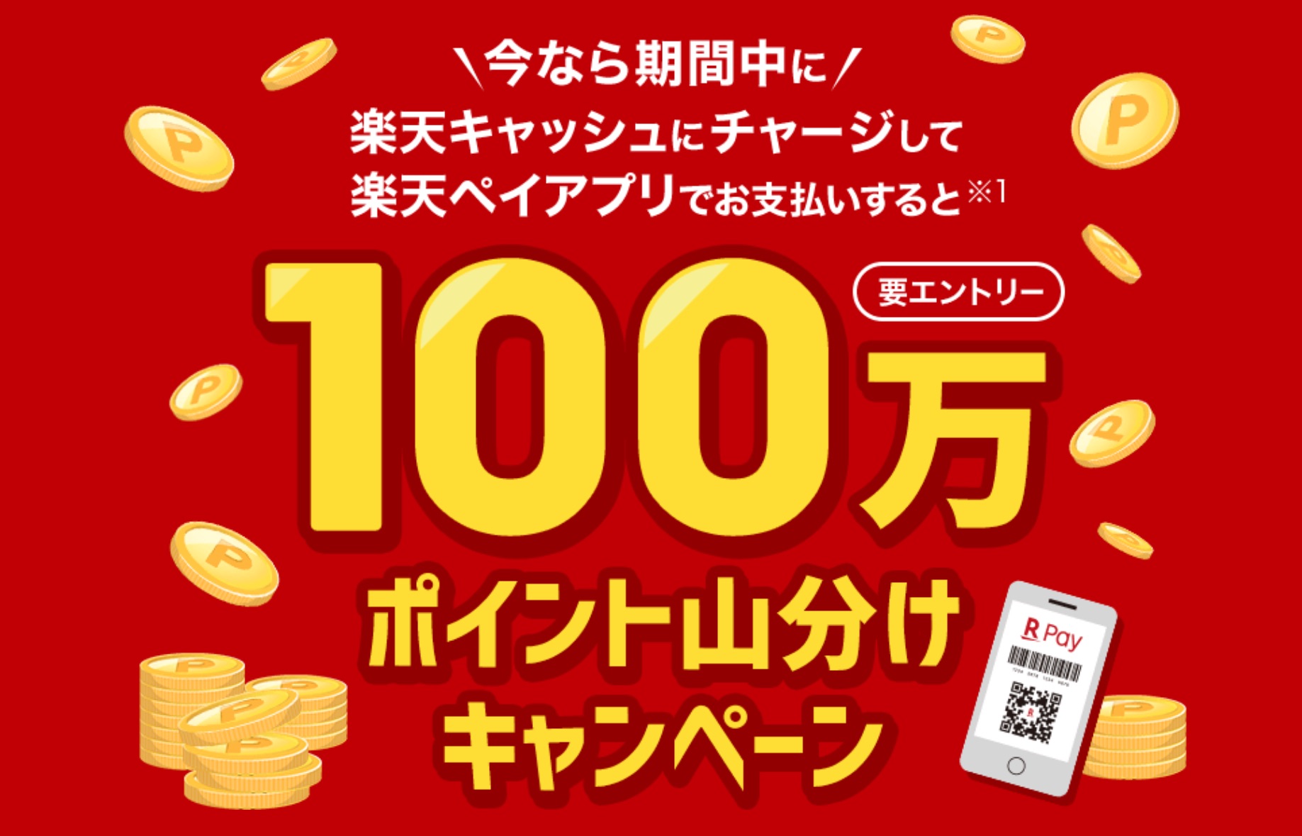 また楽天キャッシュへチャージ&楽天ペイアプリでのお支払いで100万ポイント山分けプレゼント!キャンペーンはエントリーの上、期間中に楽天キャッシュをチャージして支払い対象期間中に楽天ペイ(アプリ決済)にて楽天キャッシュを用いて決済した場合に楽天ポイントを1人最低1ポイント、最大200ポイントまでプレゼントします。