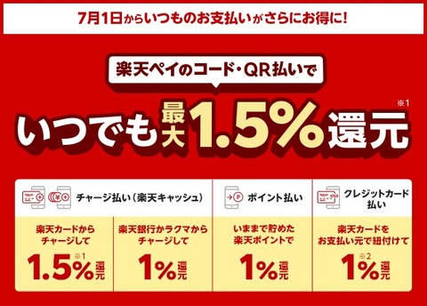 ・「楽天ペイ(アプリ決済)」、7月1日より新たな定常還元施策を開始、コード・QR払いでいつでも最大1.5%還元に|楽天ペイメント株式会社のプレスリリース