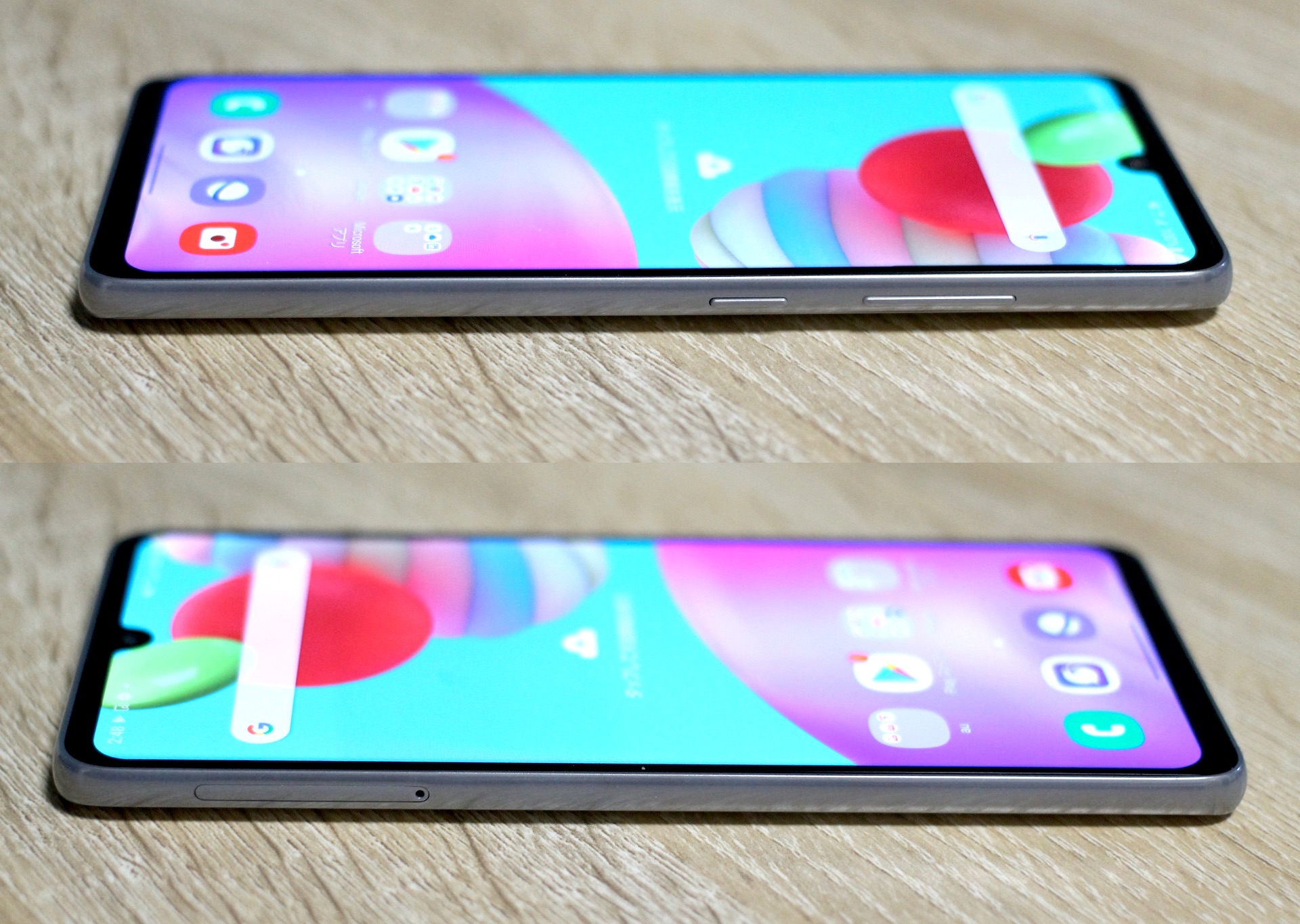 ディスプレイは画面上部中央に面積の狭い水滴型ノッチ(切り欠き)を配置したアスペクト比9:20の縦長な約6.1インチFHD+(1080×2400ドット)Super AMOLED(有機EL)「Infinity-U Display」を搭載し、Galaxy A20では液晶でしたが、有機ELとなったこともあって指紋認証は画面内指紋センサーとなりました。
