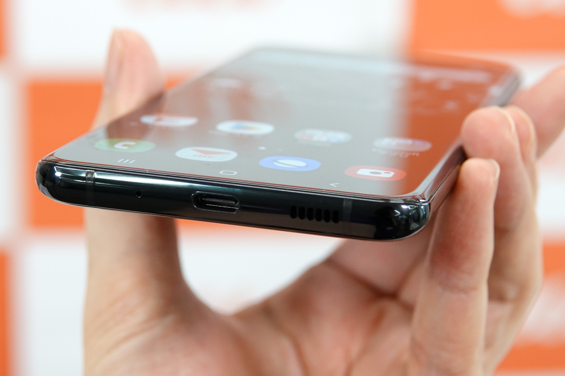 外観は他のGalaxy S20シリーズと共通しており、画面上部中央にパンチホールが配置された「Dynamic AMOLED 2X Infinity-O Display」による“ほぼ全画面デザイン”と採用する。画面はアスペクト比9:20の縦長な約6.9インチQHD+(1440×3200ドット)有機ELなので、さすがにサイズ感はかなり大きめだ。ディスプレイはHDR10+や120Hzのリフレッシュレートに対応する。