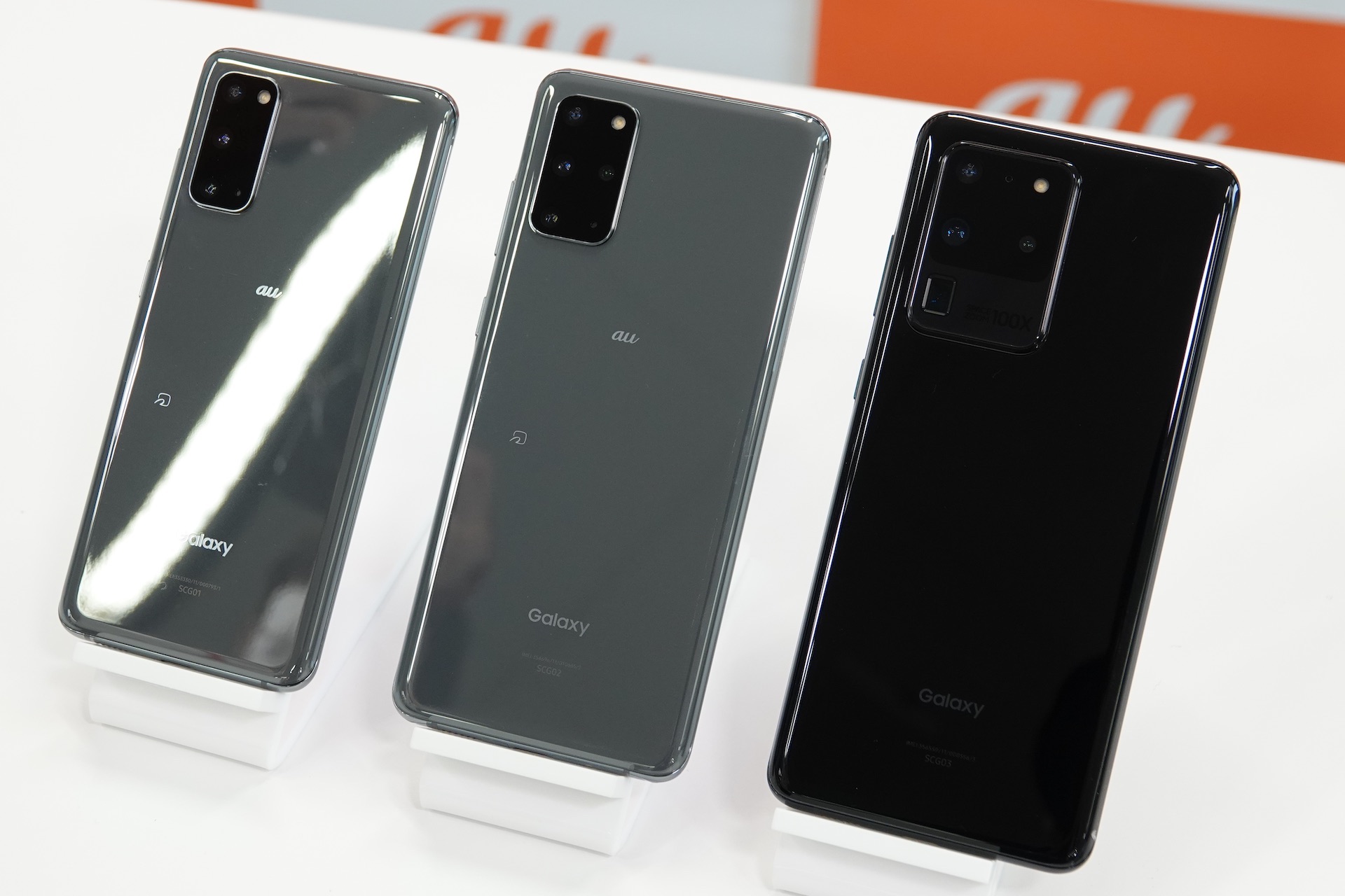 左からGalaxy S20 5G、Galaxy S20+ 5G、Galaxy S20 Ultra 5Gの「Galaxy S20」シリーズ。auでは3モデルとも取り扱うことになり、日本国内ではGalaxy S20 Ultra 5Gはauのみの販売となるとのこと