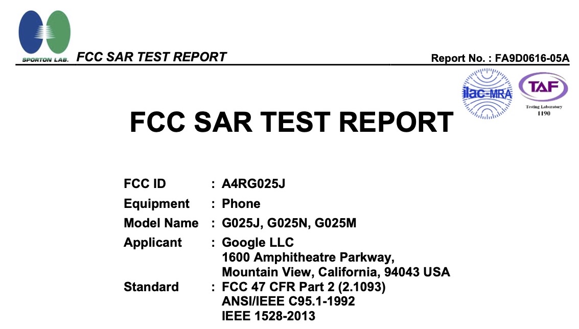 Pixel 4aと見られるG025JおよびG025N、G025MはFCCでは4G LTEのBand 2および4、5、7、12、13、14、17、25、26、30、38、41、66、71、W-CDMAのBand IIおよびIV、V、CDMA 2000のBC0およびBC1、BC10、GSMの850および1900、無線LAN(Wi-Fi)の2.4および5.xGHz、Bluetooth、NFCで認証されています。