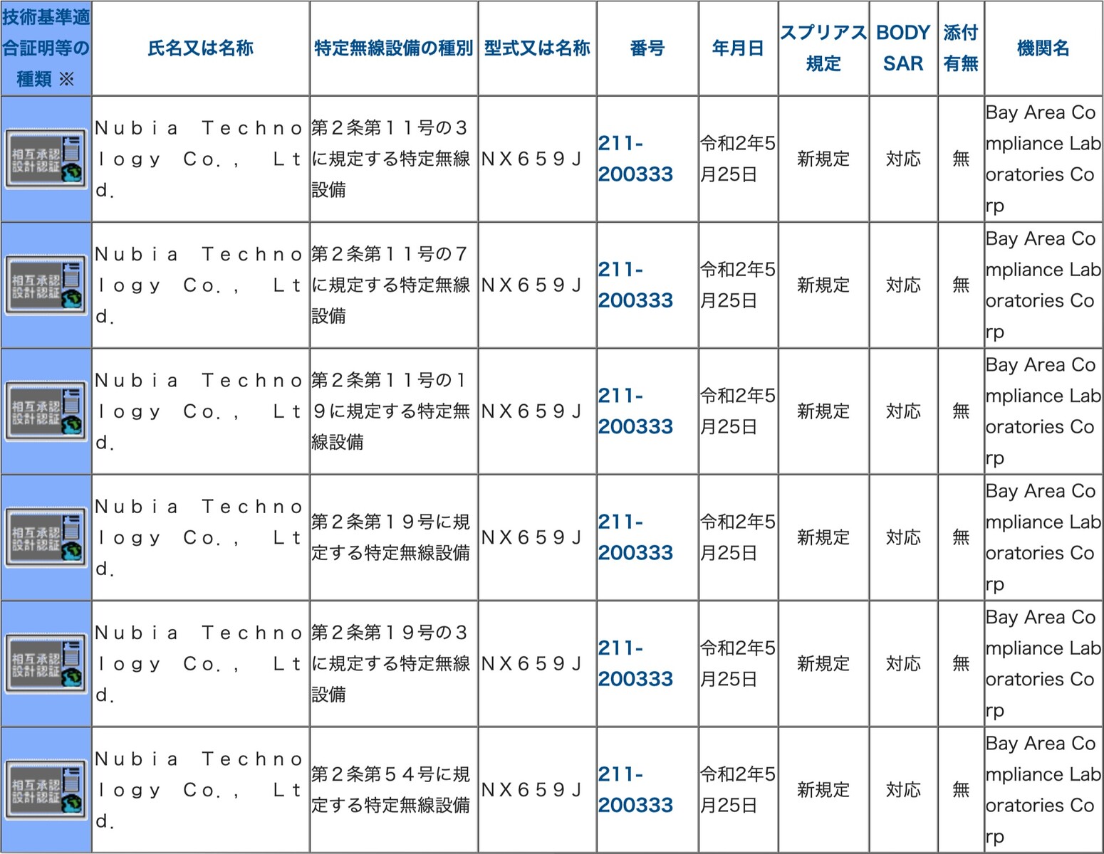 総務省が「技術基準適合証明等を受けた機器の検索」のデータベースを更新し、新たにNubia Technology(以下、nubia)が「NX659J」(認証番号:211-200333)の相互承認(MRA)による工事設計認証(いわゆる「技適」)を2020年5月25日付けでBay Area Compliance Laboratoriesによって取得しています。