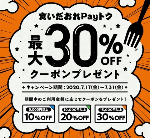 LINE Payは17日、スマートフォン(スマホ)など向け送金・決済サービス「LINE Pay」( https://line.me/pay )において対象加盟店で注文をした場合に次回以降に使える最大30%OFFの「スペシャル特典クーポン」がもらえる「食いだおれPayトク」( https://linepay.line.me/event/kuidaore-paytoku.html )を2020年7月17日(金)0:00から7月31日(火)23:59まで開催するとお知らせしています。