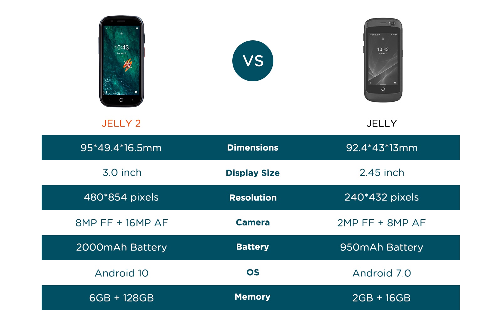 Jelly 2の主な仕様は約3.0インチFWVGA(400×854ドット)液晶およびMediaTek製チップセット(SoC)「Helio P60」、6GB内蔵メモリー(RAM)、128GB内蔵ストレージ、microSDXCカードスロット、2000mAhバッテリー、USB Type-C端子、Android 10など。