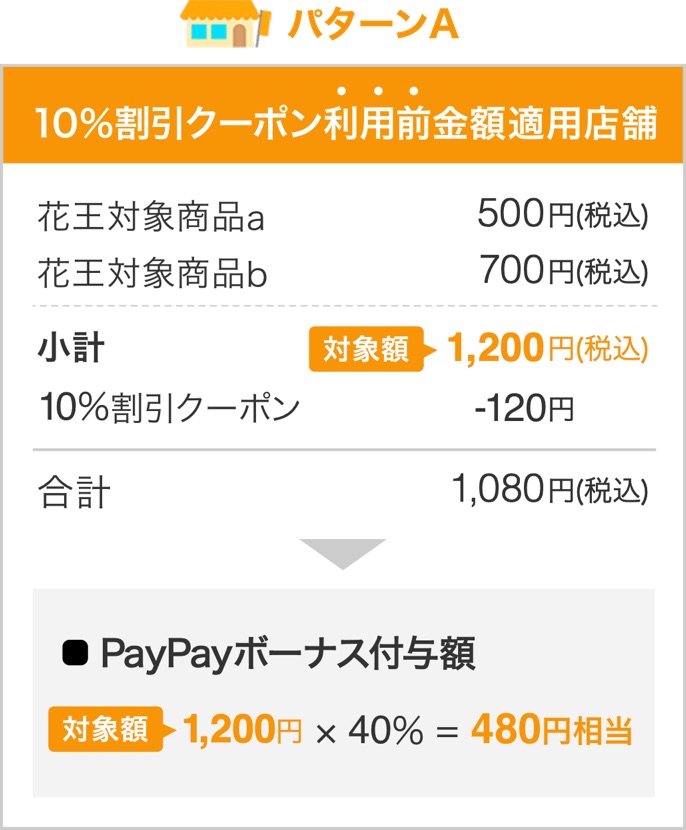 なお、値引きやクーポン、各企業で使えるポイントを利用の際に店舗によってPayPayボーナス付与の対象となる金額が利用「前」もしくは「後」で異なります。買い物の合計金額から10%割引されるクーポンを使用した場合の例は以下の通り。詳細は各対象店舗の適用条件をご確認ください。その他、キャンペーンの条件や注意事項はPayPayの公式Webサイトや公式アプリをご参照ください。