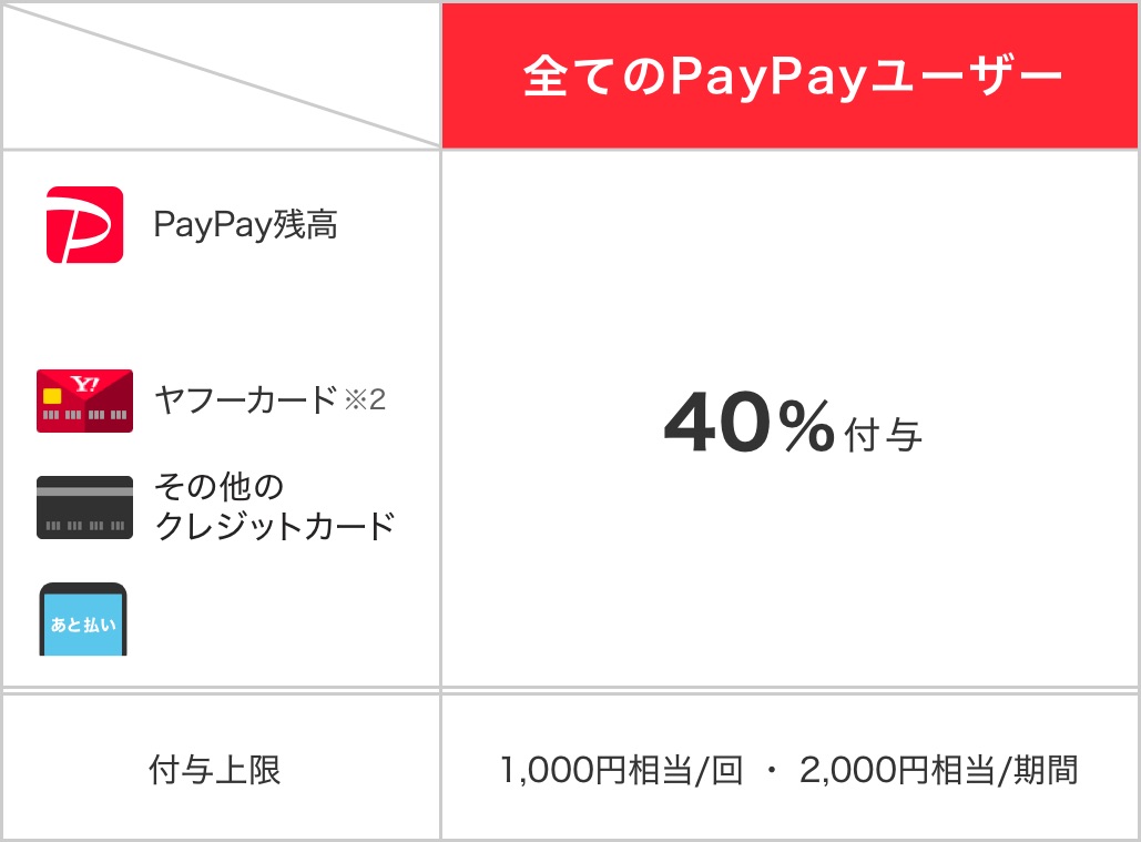 支払方法はPayPay残高のほか、Yahoo! JAPANカード(ヤフーカード)を含むクレジットカード、PayPayあと払い(一括のみ)が対象で、付与上限は1,000円相当/1回、2,000円相当/期間まで。なお、本キャンペーンはいつもどこかでお得なキャンペーンを実施する「いつもどこかでワクワクペイペイ」(2020年9月)の一環として開催するということです。